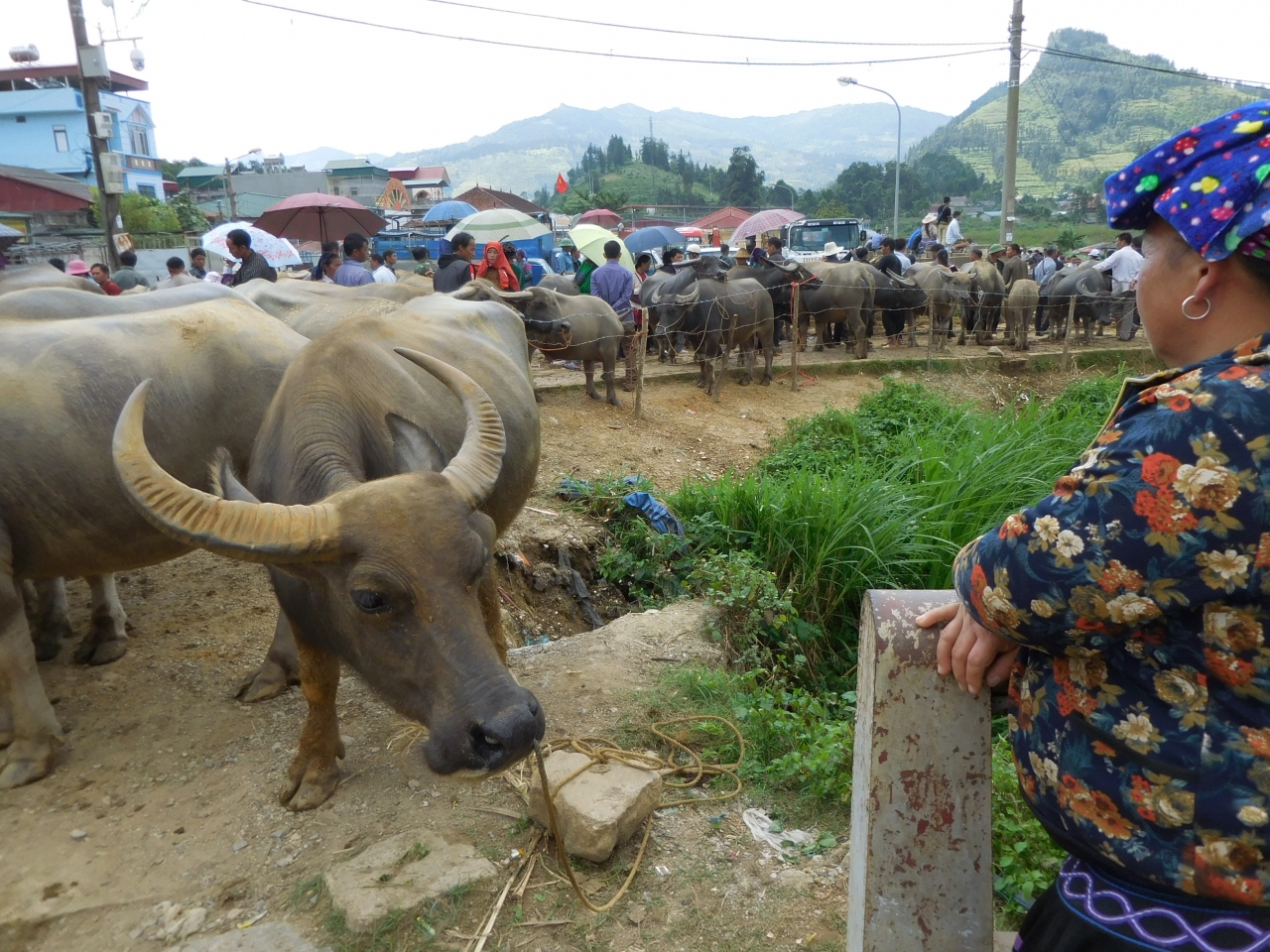 サパからはラオカイまで山を降りて、そこからさらに反対側に曲がりくねった山道を登り続けてやっとたどり着くような場所にあります。近隣の少数民族が日曜日に集まってくる場所なのでとても賑やかです。観光客向けの土産物のほか、農作物や家畜なども売られています。川岸で行われていた水牛の市が迫力満点でした。