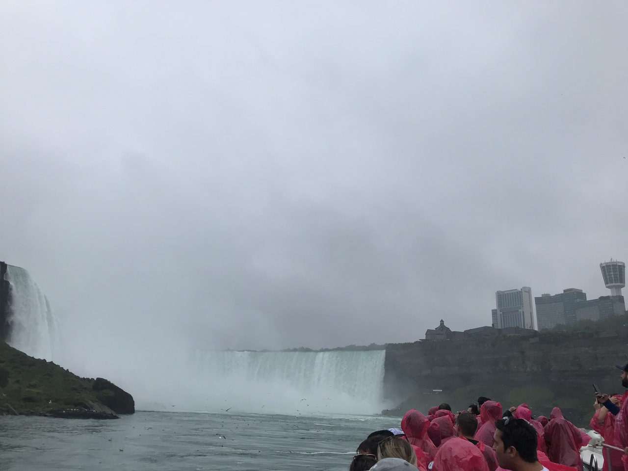 天気は曇りで雨もパラついていて、肌寒かった。チケットを購入して、赤いビニールカッパを着てクルーズ船で真近まで行った。