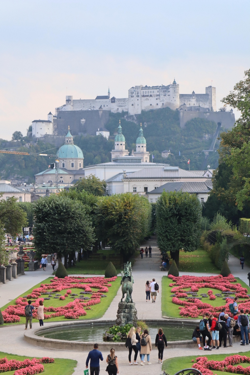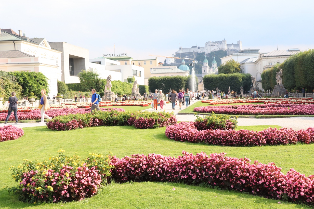 新市街のミラベル宮殿の隣にあります。各方面へのバスストップであるMizrabellplatの近くです。宮殿にはそんなに魅力は感じないけど、この庭園越しに見るザルツブルク城はとってもいいアングルで写真スポットになっています。庭園の綺麗に手入れされた花壇越しにいい写真が撮れるので人気なようです。