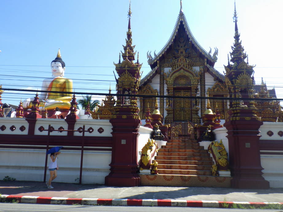 お堀沿いを歩いていたらチャーン・プアク門の近くにWat Rajamonteanというお寺ががありました。ガイドブックには載っていませんでしたが、通りから伸びた階段と、大きな大仏が目を引くお寺でした。階段の先の本堂のドアが閉まっていたので参拝できないのかと思い、外観だけ見るにとどめました。
