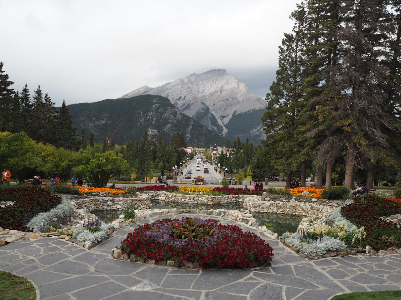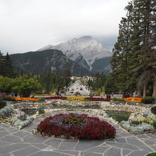 バンフの街の端にある庭園。色とりどりの花が咲き誇り、とても綺麗。また、庭園内からバンフの街を見渡すと、手前に庭園の花、奥にバンフの街並み、背景には山々がそびえたつという景色になっており、こちらも絶景。