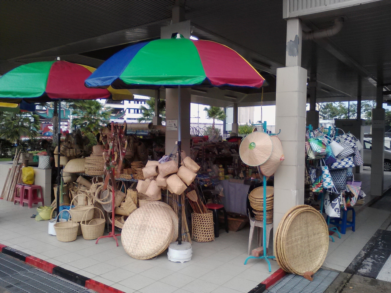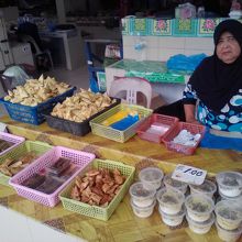 BSBの中央市場だと思いますが規模的にはそれほど大きくありません。野菜や果物、肉などの生鮮品に混じってお粥やナシチャンプル、スナックなども売られていて値段はレストランに比べると激安です。その場で食べられるテーブルとイスもちゃんと用意されています。竹や籐で編んだカゴやざるなど生活で利用する“ハンディクラフト”の店もあります。一部お土産になりそうなものもあります。行くなら賑わっている朝です。