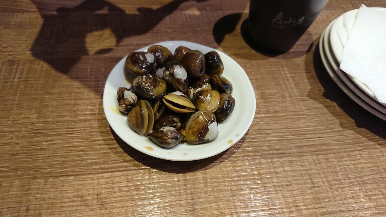 坦仔麺はお約束としていただくとしまして、今回は鹹蜆仔(しじみのニンニク醤油漬)です。小さいですが、1皿50元(175円)しょっぱくて、ニンニクが効いていてビールに合う!!ビールが60元であと、煮玉子10元で充分せんべろです。〆は坦仔麺50元今回は貢丸と煮玉子をつけてます。坦仔麺にはニンニクがのっているので嫌いな方はご注意を!