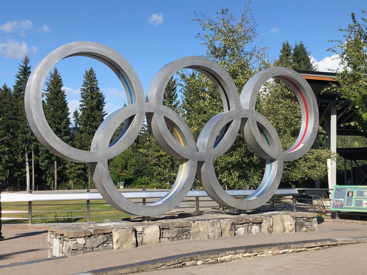 ウィスラービレッジを散歩していると大きなオリピックマークが現れます。記念撮影をするグループが集まっていました。周囲の小川のまわりには芸術作品のような彫刻が置かれていて、ちょっと変わったものがありました。これだけを見に行く人はいないと思いますが、散歩するにはちょうどいいオブジェです。