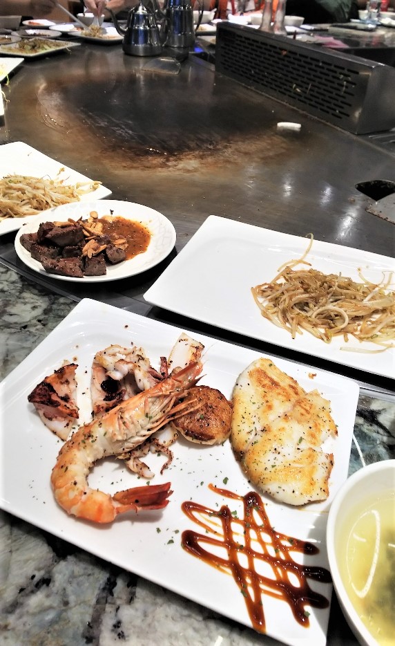 目の前で焼かれる牛肉や魚介類を堪能