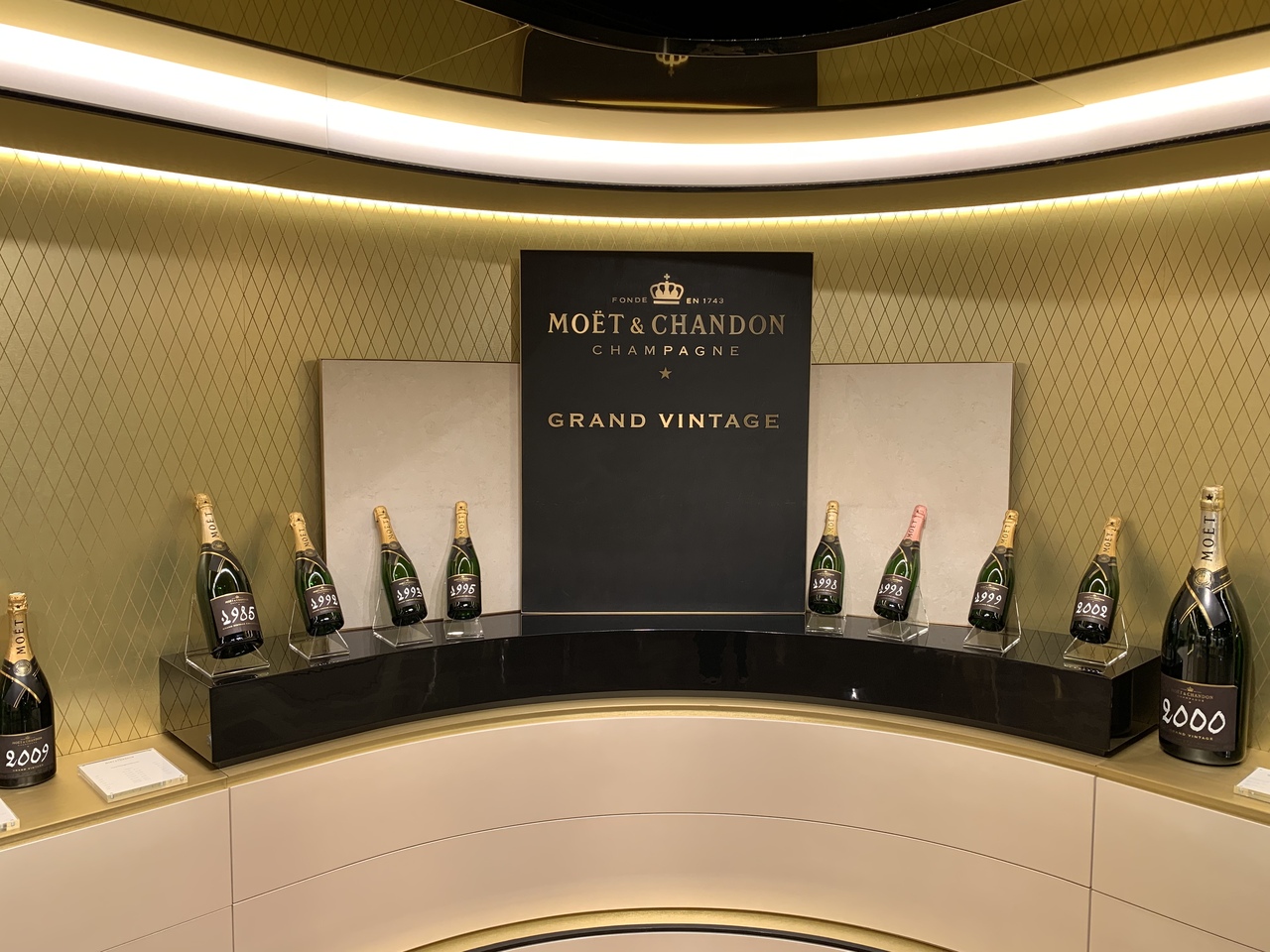 有名なメゾンですが、見学ツアーはたくさんやっているので予約は一週間前でも時間など選べました。敷地内にはドンペリニヨン像があり、大きな建物内にショップや豪華な待ち合いスペースが、地下には広大なカーヴが広がっていました。さすがモエ、という感じでした。