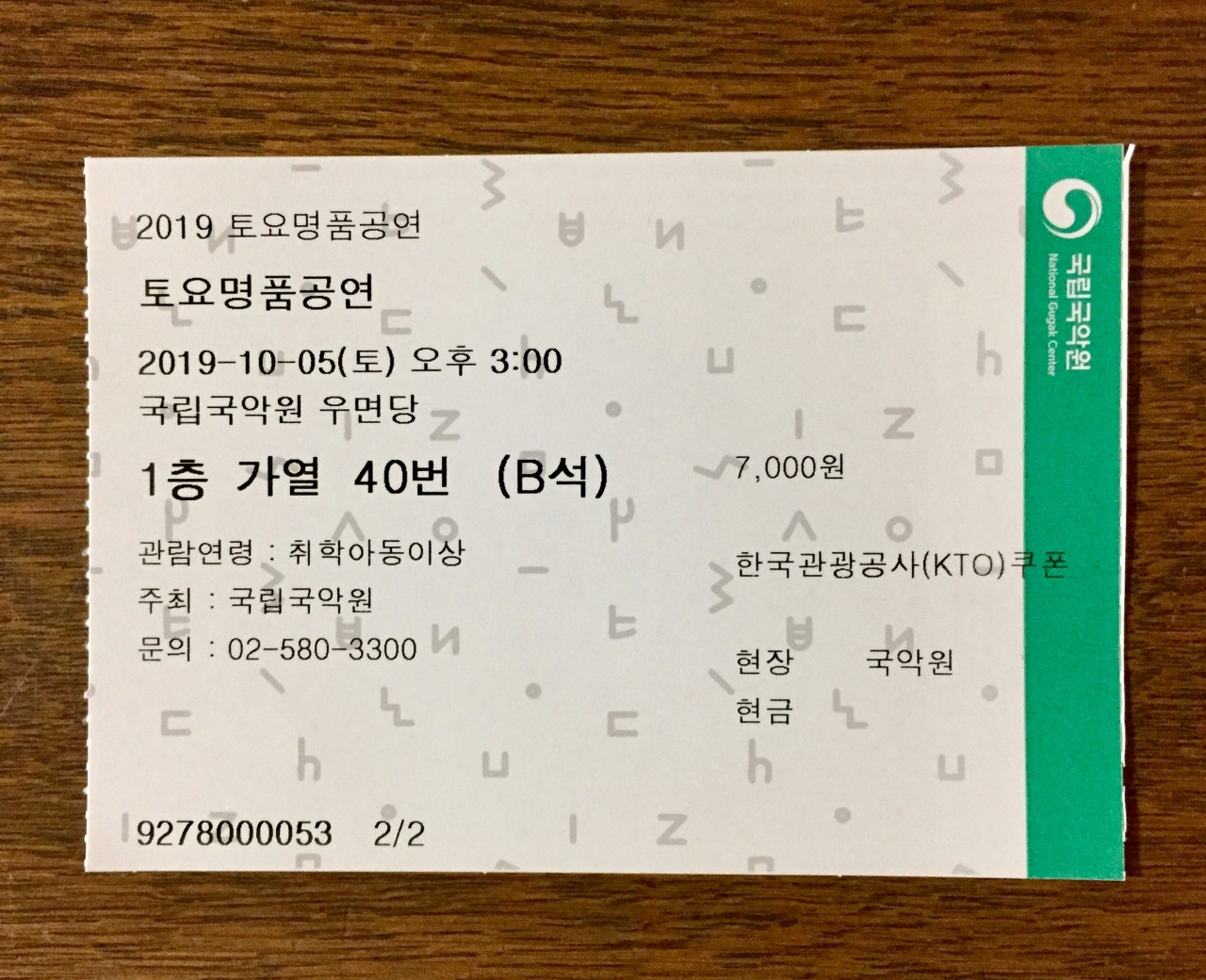 この日の演目は「韓国の民族音楽」でした。音楽だけで踊りが無いので、B席でいいかな?と安い方の席にしました。私は直接行って、牛眠堂のチケットカウンターで購入しました。web上にあったクーポンで30%OFFでした。