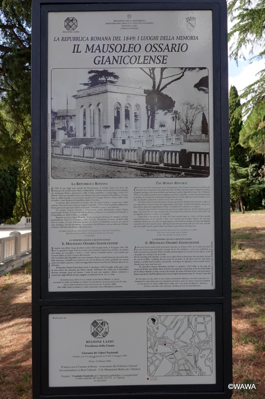 ガルバルディ軍の霊廟へは、路線バスでジャニコロの丘頂上付近まで登り、丘の麓にあるトラステヴェレ教会辺りに向かって下り坂を散策中に立ち寄りました。軍事家ジュゼッペ・ガリバルディの元で、一連のイタリア統一運動の中でローマのために戦った戦死者のための美しい納骨堂です。訪問時は半地下の内部見学も可能でしたが、金色に輝くモザイクタイルで彩られた荘厳な場所でした。