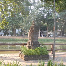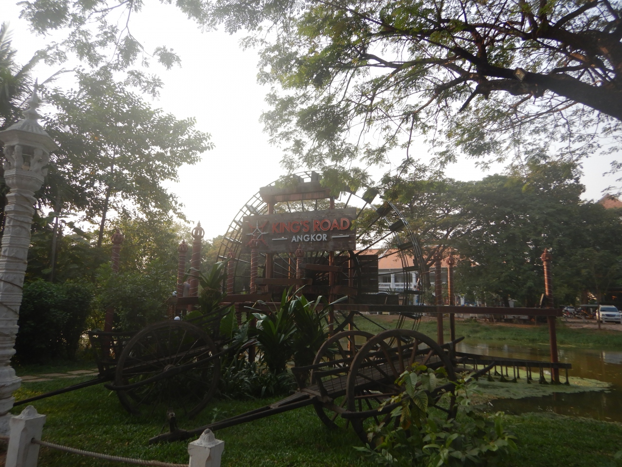 国道6線のシェムリアップ川に架かる橋を渡り、オールドマーケット前までが私がよく歩く散歩コースだ。途中で疲れたらカフェでジュースを飲んだり、ビールを飲んだりして休憩しながら歩く。所々にヴィシュヌ神の像やバイヨンの4面像みたいなレプリカ、水車などがあり、楽しめる。