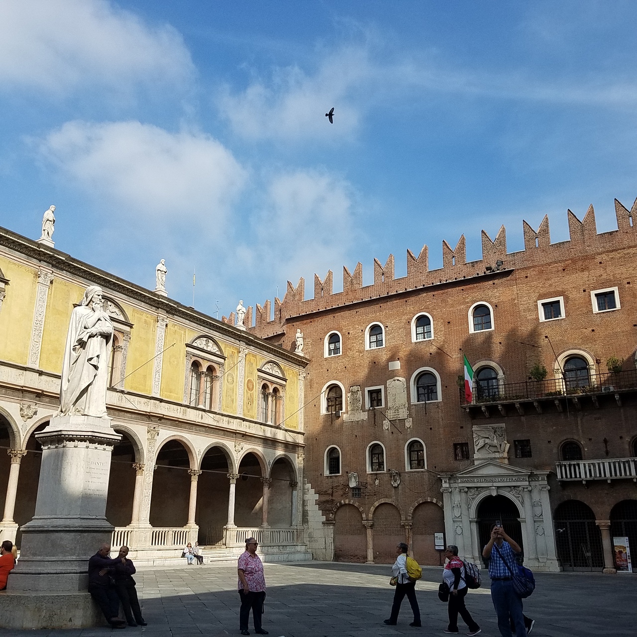 広場にはヴェローナで亡命生活を送ったダンテの像があります。