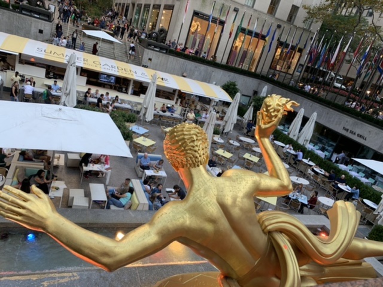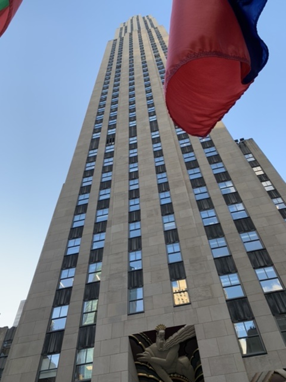 1日中も歩き回ったあとだったので、もはや広場に降りる元気はなくあの有名な黄金の像を後頭部から見下ろしてその場を去りました。冬はスケートリンクとクリスマスツリーで見ものなのだろうな、と思います。広場の向かいにビルがあります。こちらも同じく展望台ののぼってこそ価値がある建物だとおもいます。