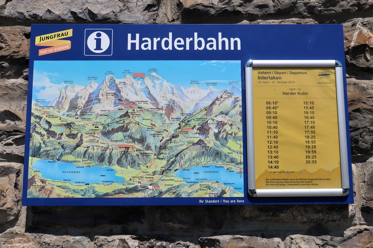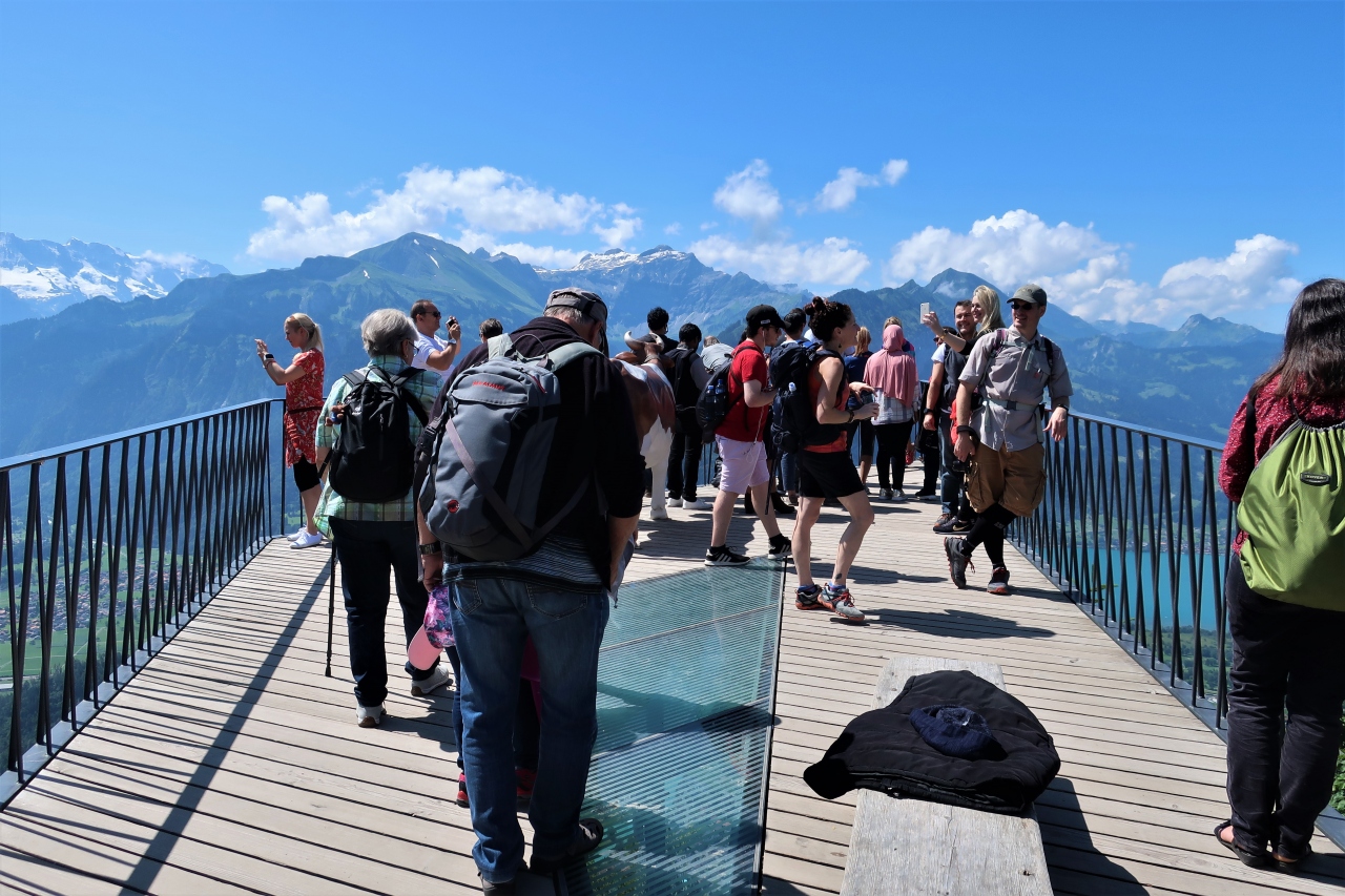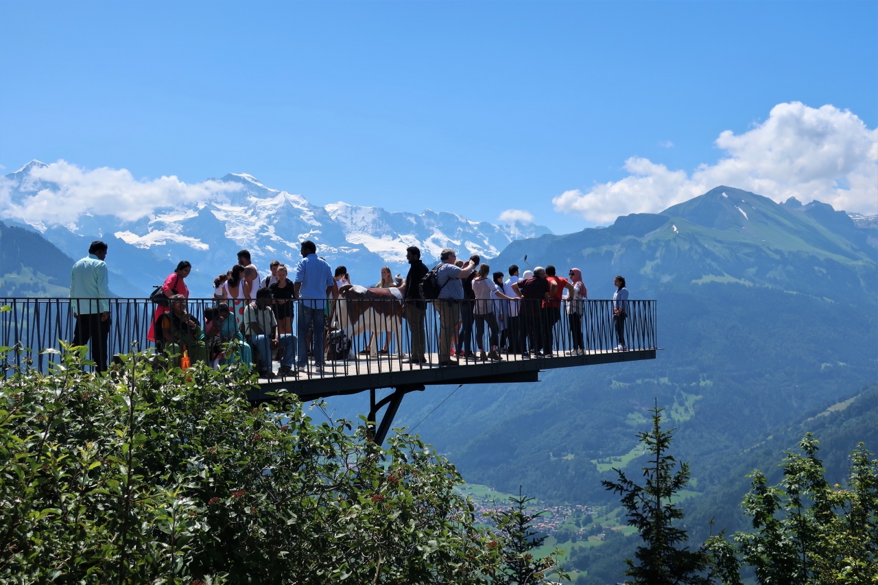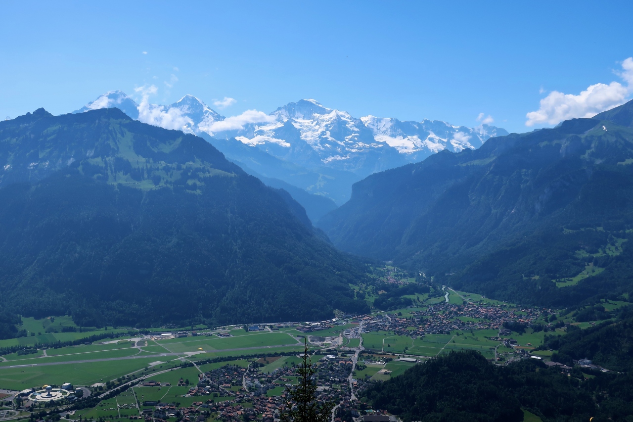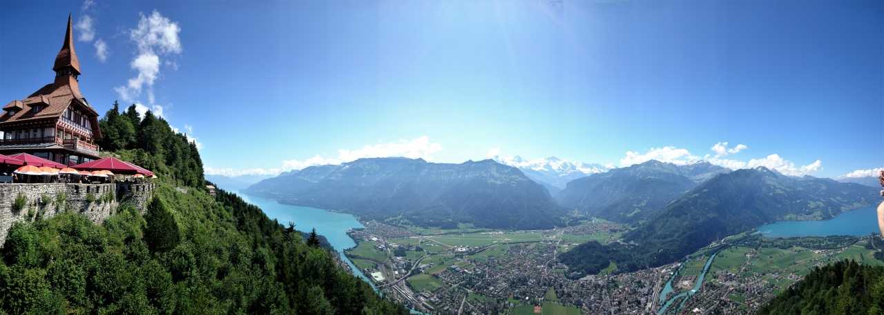 標高1322mのハーダークルムの山頂にある展望台からは、眼下にインターラーケンの町とトゥーン湖、ブリエンツ湖、そして正面にはアイガー・メンヒ・ユングフラウといった雄大なアルプスの絶景を一望することが出来ます。