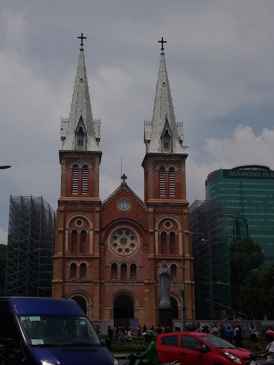 フランス領時代を感じることのできる教会です。まわりは赤レンガで作られており、内部はステンドグラスで飾られていて、とても美しいです。聖マリア教会ともよばれ、キリスト教の中でもカトリックの教会とのことです。後ろのほうは修復工事をしていました。