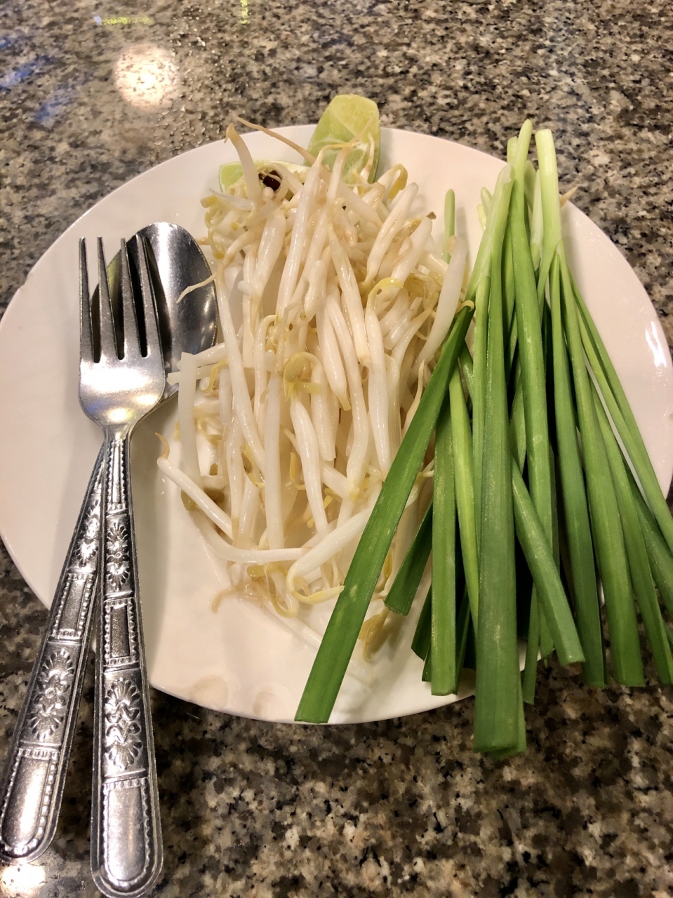 まずは生レタスと細いネギのような物が出てきます。ベトナム意外で付け合わせに生野菜が出てきたのは初めてでした。もやしを生で食べることに慣れていないのでちょっと食べて断念。