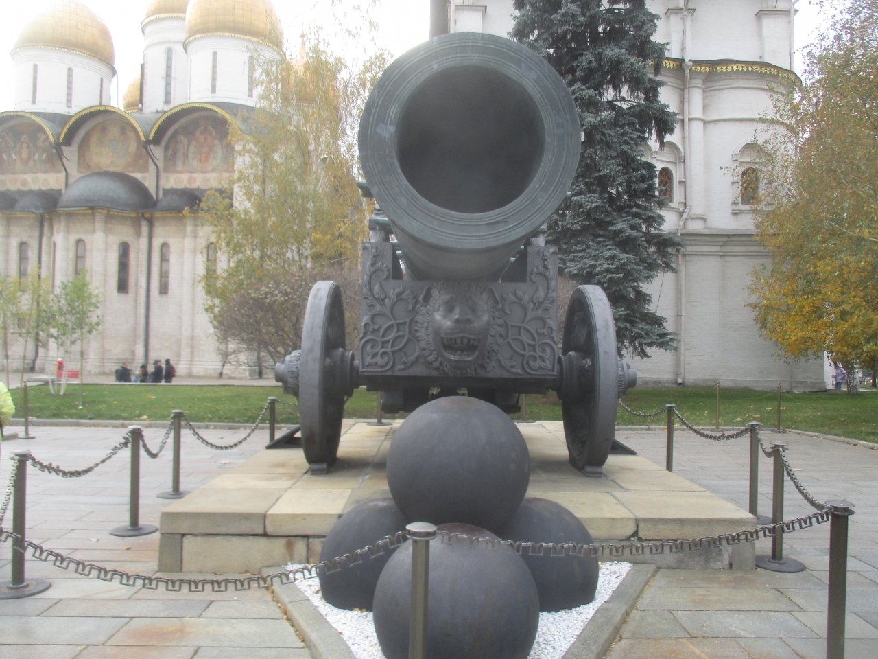 クレムリンの敷地内にある見どころのひとつです。16世紀末に造られた大砲で、当時としては世界最大の口径をもった大砲でした。かつてはスパスカヤ塔の門を守るために置かれていたようです。見学コースに沿って進めば間近で見ることができました。