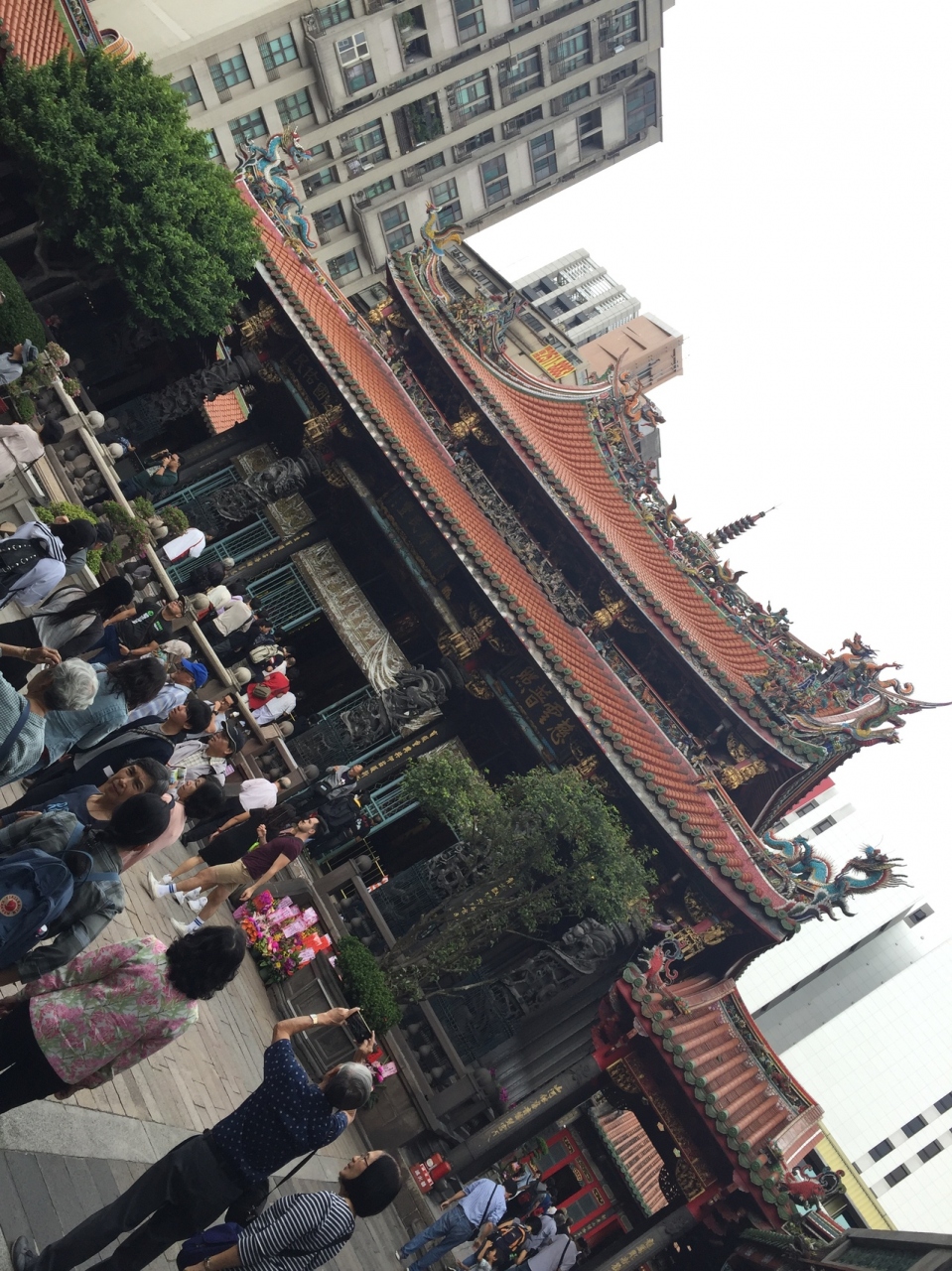 台北で最も長い歴史を持つお寺。龍の彫像が印象的。仏様や神様が100以上祀られている最強のパワースポットだそうです。入り口で一本ずつお線香をいただき、火をつけて、参り、最後に香炉に立てます。正式な参拝方法はよく分かりませんでした。でも少しは運気が上がったかな。