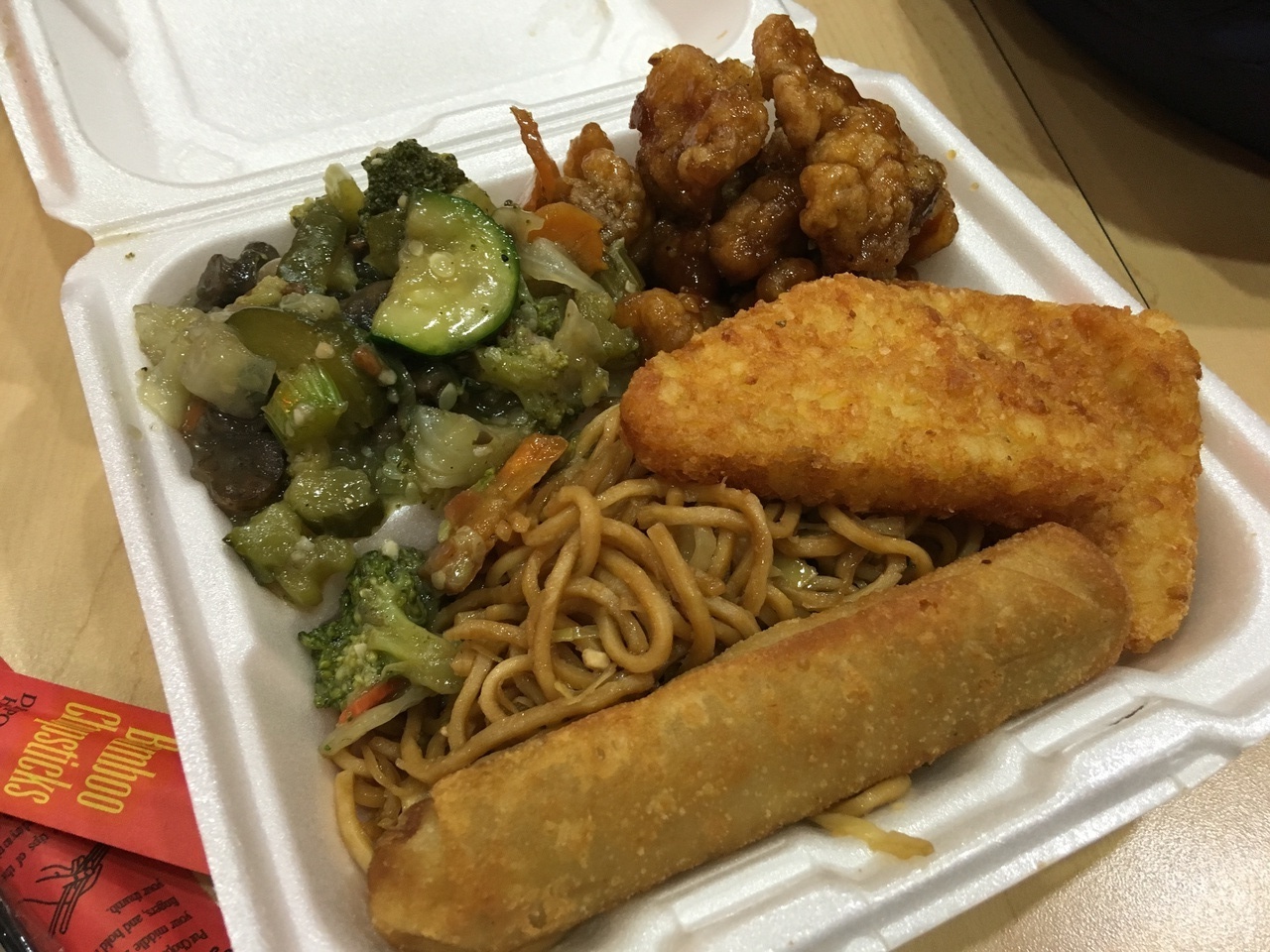 麺類かご飯を選んで、おかずを選ぶという注文スタイルでした。春巻きとハッシュドポテトが食べたかったのですが、こちらは別料金だったので、別で注文しました。おかずの並びにあったので、間違えないように注意が必要です。