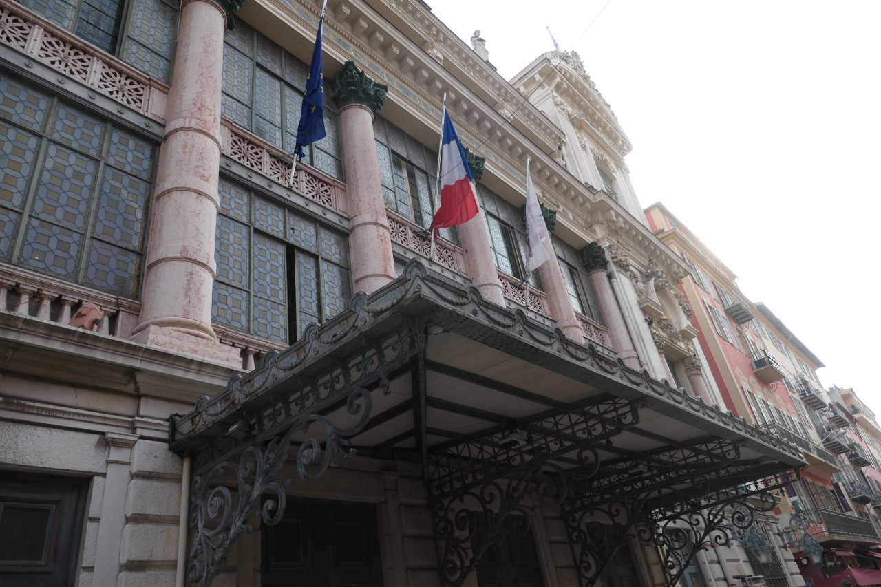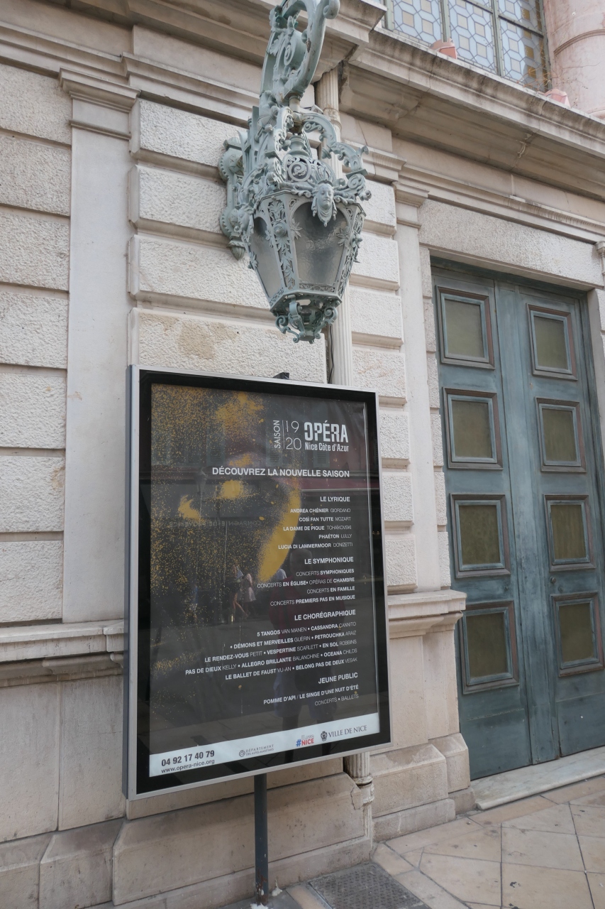 ニースオペラ座は旧市街の海側にあり、海岸沿いの散歩道プロムナード デ ザングレから容易にアクセスできました。旧市街のサンフランソワドポール通りに面しているのが建物正面で、旗が掲げられていました。ニースオペラ座の現在の建物は1885年の建造です。重厚で見事な建物です。オペラ座入り口に写真付きのパネルがありましたが、フランス語だけだったので良く分かりませんが、8月公演は行われていないようでした。昼間の訪問でしたが、扉は閉ざされていました。