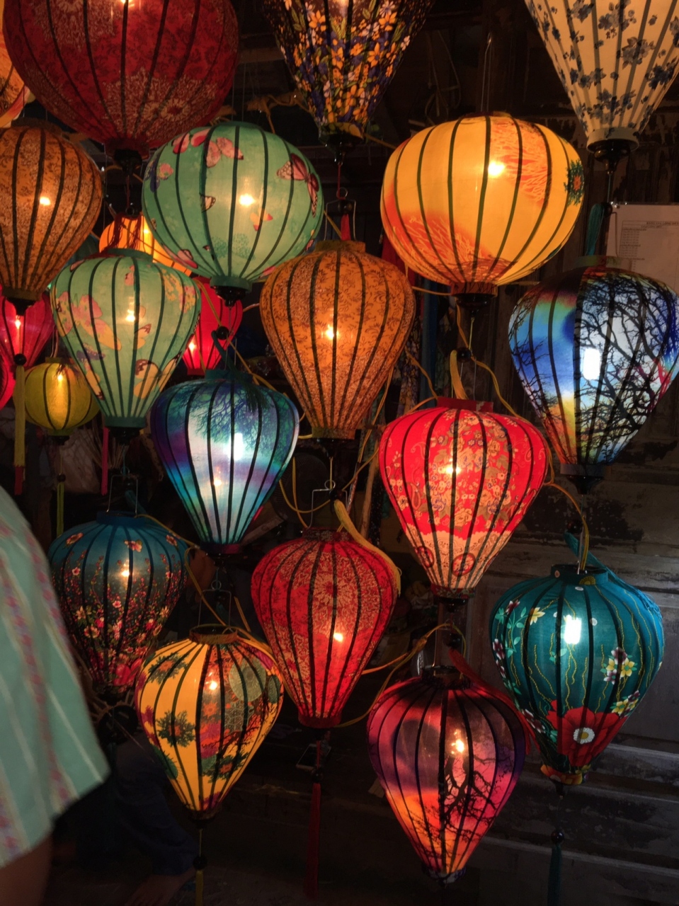 昼間のホイアンも素敵ですが、夜はランタンが灯り美しいとの事で、夜にも旧市街を訪れました。ナイトマーケットには色々なお店が有りますが、やはりランタンを買ってみたい。カラフルな色のランタンも良いですが、竹で作ったシンプルなランタンも素敵です。折りたためるので持って帰ることも可能です。