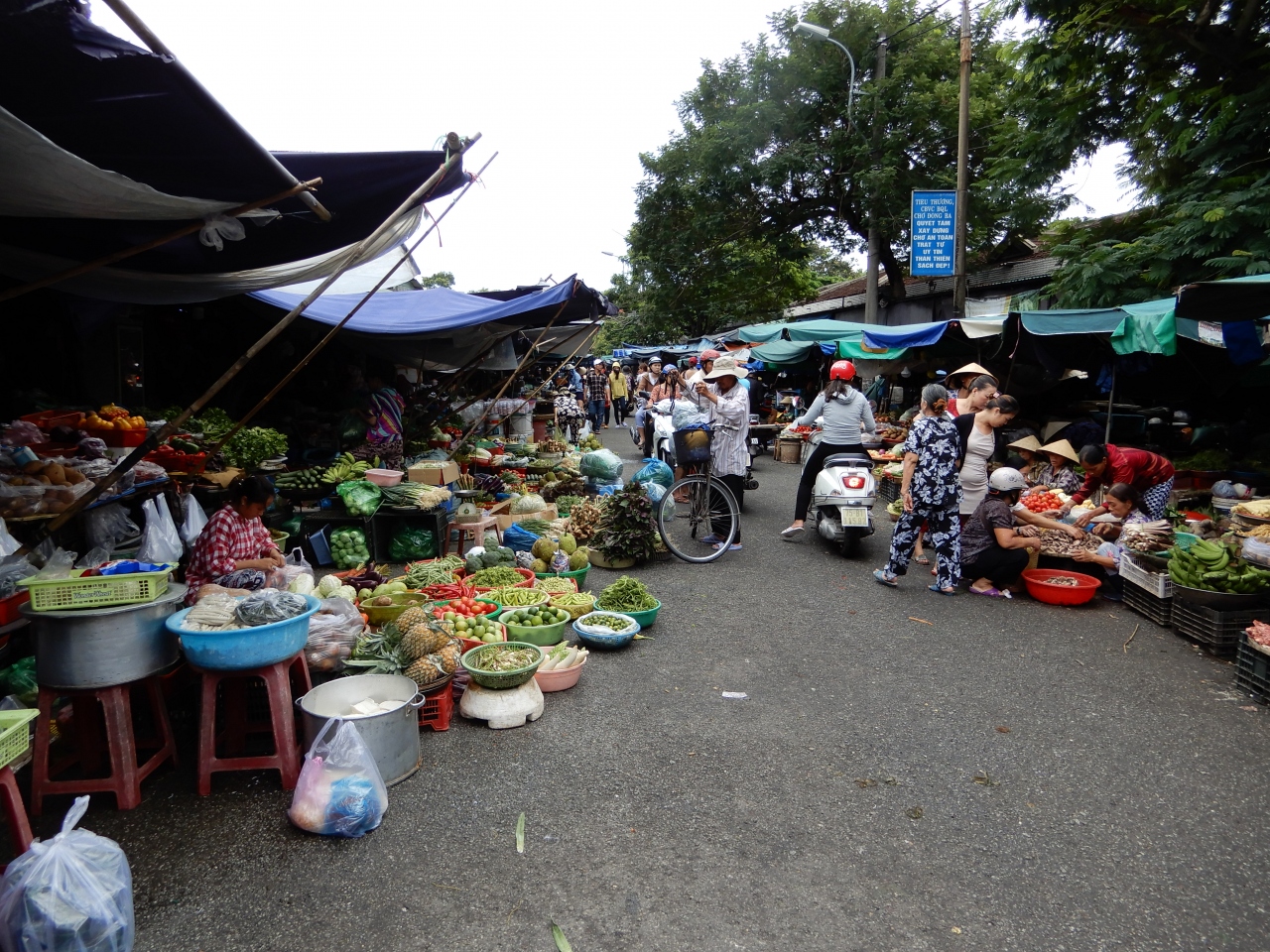 フエの旧市街のフォン川沿いに築かれた市場です。観光客もちらほらと見かけますが、まだまだ純粋な地元民の台所という感じが強いです。果物や野菜、精肉に鮮魚と食料品が所狭しと並べられるほか、玩具や化粧品、腕時計などの生活用品もたくさん並んでいました。階段を上がると市場のごちゃごちゃっとした屋根を見下ろすことができ、さらに2階部分は豊富な衣料品が売られていました。