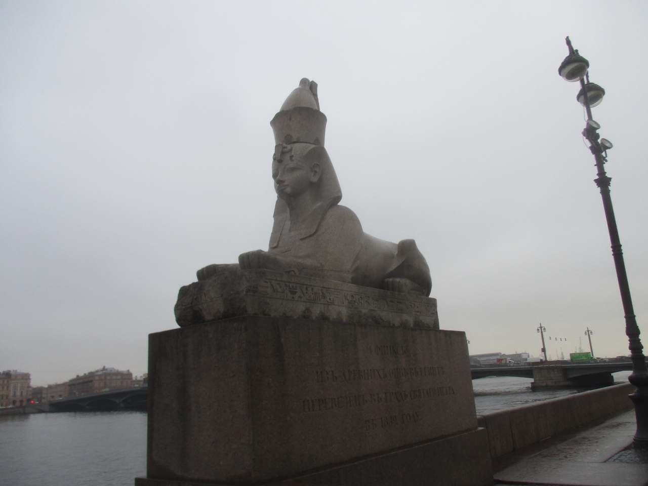 1830年、ロシア人がエジプトのアレクサンドリアで売りに出ているスフィンクス像を見つけ、購入をロシア政府に打診し芸術アカデミーで購入することになりました。ヴァシリエフスキー島にある芸術アカデミーの庭に置いてありましが、1934年、船着き場の守り神のように設置されました。足の部分を触ると幸運になるとのことで、そこの部分がきれいに剥げていました。見学したときは是非触ってみて下さい。