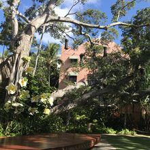 建物の中に椅子がたくさんあったり、お花がたくさん植えられていたり、