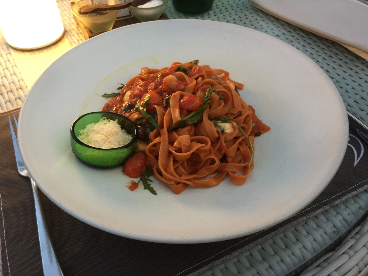 先ずはハイネケンを!そしてアンダルシアンガスパチョを、ガスパチョがソルベにされたのが真ん中に入ってる!暑いところではいいね。次はトマトタリアテッレカプレーゼ、トマトを練りこんだタリアテッレにミニトマトとモッツァレラ、これもナイス!