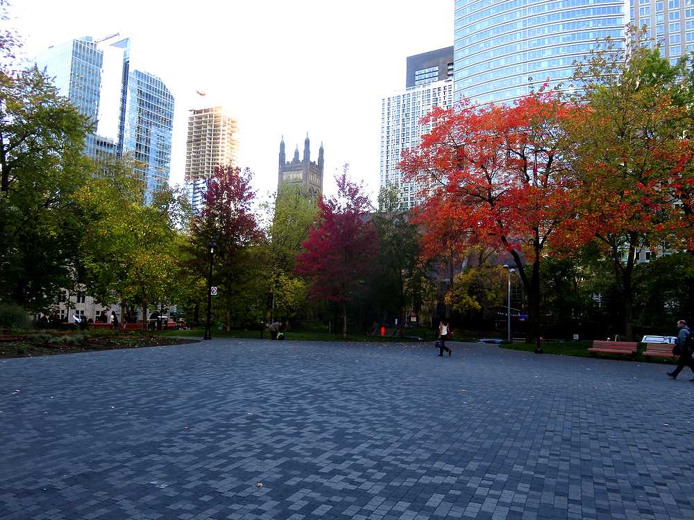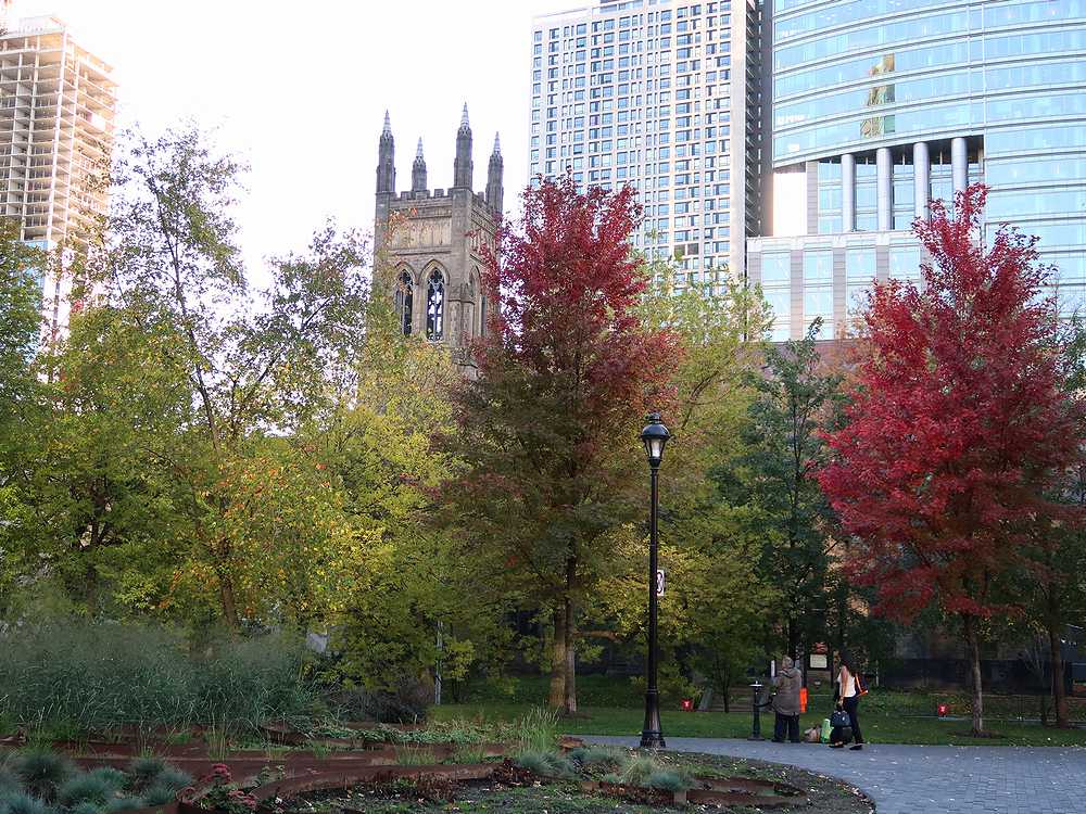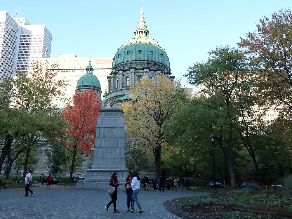 地下鉄Bonaventure駅から歩いて5分ほど歩いたところにあり、斜め向かいには世界の女王マリア大聖堂、横にはギリシャの神殿に似た重厚な建物などに囲まれた比較的小さな広場です。私達は世界の女王マリア大聖堂を見学した後、公園内のベンチで休憩するために立ち寄りました。おやつのクッキーを食べていると、足下にリスが寄ってきて、おねだりをしているかのようにじっとみつめてきました。人を怖がっている様子は全く見られず、人馴れしているようでした。広場中央にはローリエ卿の銅像やボーア戦争の記念碑がたっています。訪れた時が紅葉の季節だったので、公園内の紅葉も見ごろを迎えきれいでした。ベンチが置かれているので、ちょっとした休憩にはいいところです。
