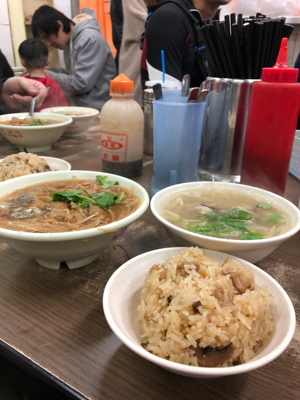 饒河街觀光夜市の真ん中あたりにあるお店。屋台ではなく、店舗として店を構えています。間口は狭いですが、奥に進めば席があります。メニューは油飯、肉羹、麵線の3種類のみ。油飯が美味しい!テーブルにおいてある甘辛いタレをかかると味が引き締まり、さらに美味しくなります。