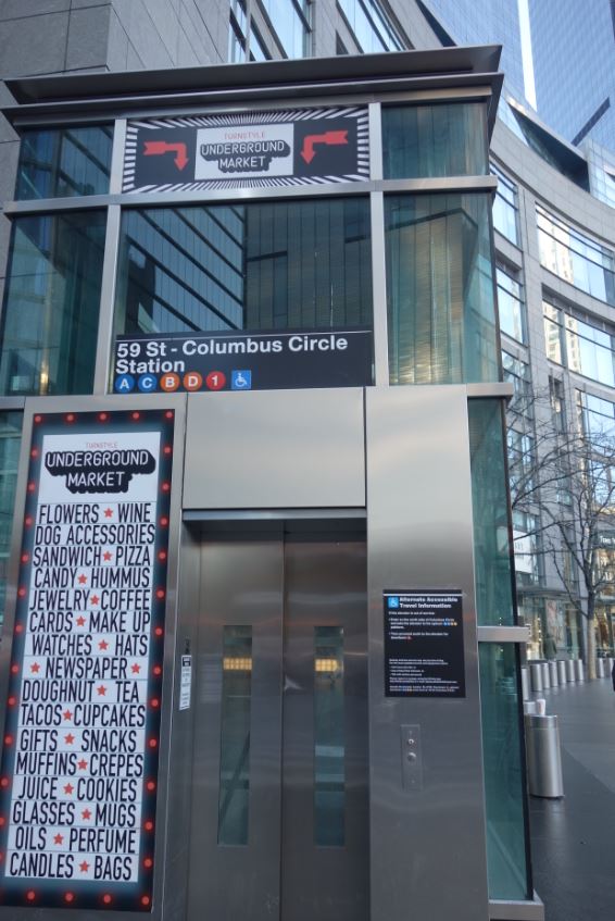 59丁目コロンバスサークル駅は地下鉄1・2系統、A・B・C・D系統と多くの線が交差する乗り換え駅です。タイムワーナービルからコロンバスサークル広場の地下の広いエリアが駅の敷地になっています。タイムワーナービルには小さな地下モールがあります。