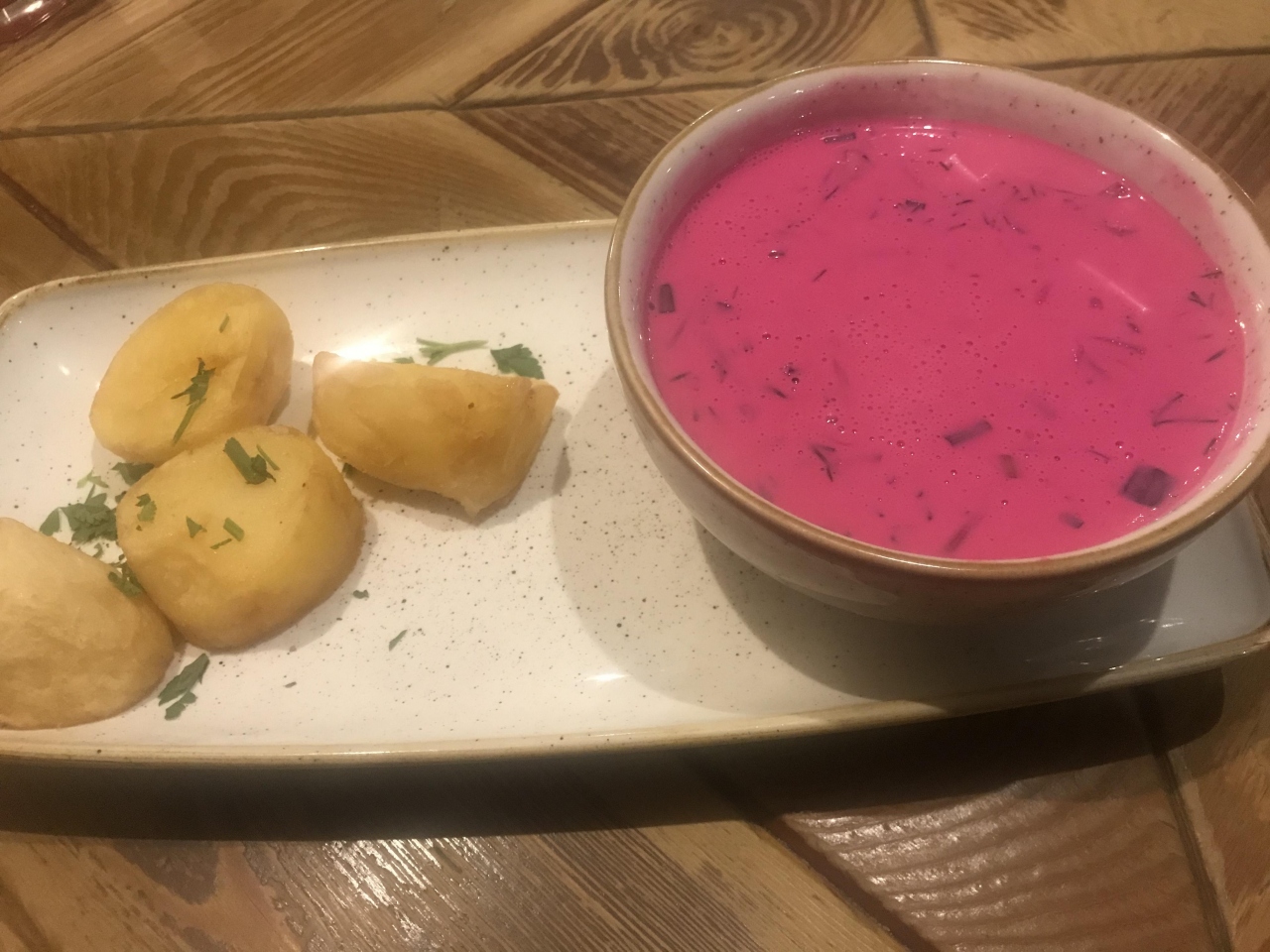 リトアニア料理のツェペリナイやジャガイモのパンケーキにひき肉を炒めたものを挟んだものや自家製の飲み物、スープなど気になるものがたくさん。ツェペリナイとジャガイモのパンケーキは一つから頼めるのが一人旅には嬉しい。ツェペリナイはもちもち生地にひき肉が入っていて、一つでもお腹いっぱい。ツェペリナイだけだと2つ付いてきます。ビーツのスープがすっごいピンクで驚きますが、私は好きな酸っぱさでした。自家製ドリンクはイマイチでしたが、消化を助けてくれているのか、最後はむしろ飲みたくなりました。
