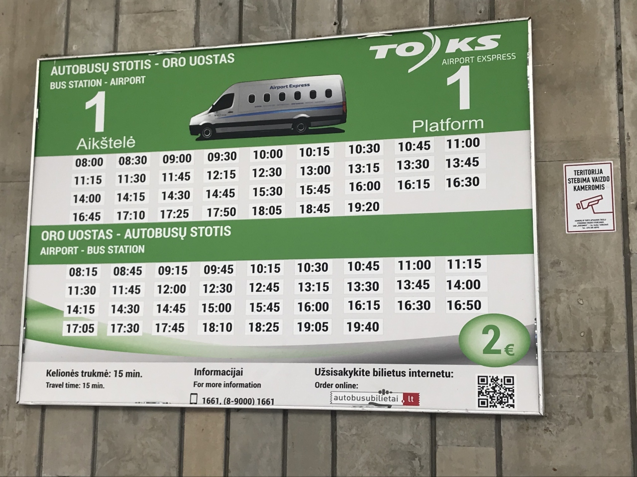 ビリニュスバスターミナルからビリニュス空港までのバスはミニバンで、15人乗りで荷物も後ろのトランクだけでした。15分くらいの距離で2ユーロ。運転手からも直接買えますし、チケット売り場でも買えます。チケット売り場で買ったときは時間を聞かれました。