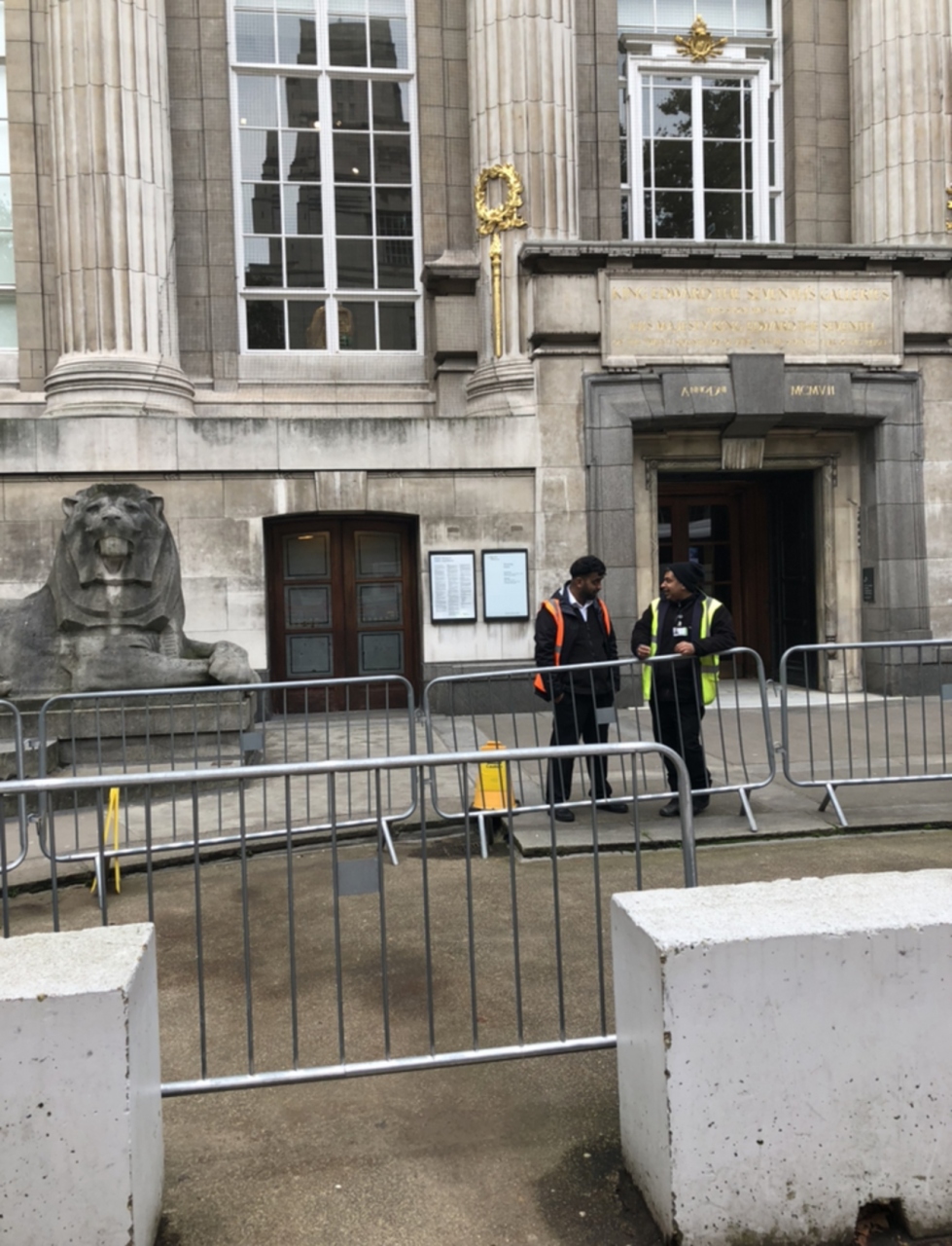 ラッセルスクエア駅から歩いて行きました。すると、博物館の裏門にでくわすことになります。一瞬違う、と思いましたが、複数の入口があると判明。セキュリティ検査の列がほとんどないが、のちに博物館の正面玄関を出る時に長いセキュリティ検査の列を見えました。