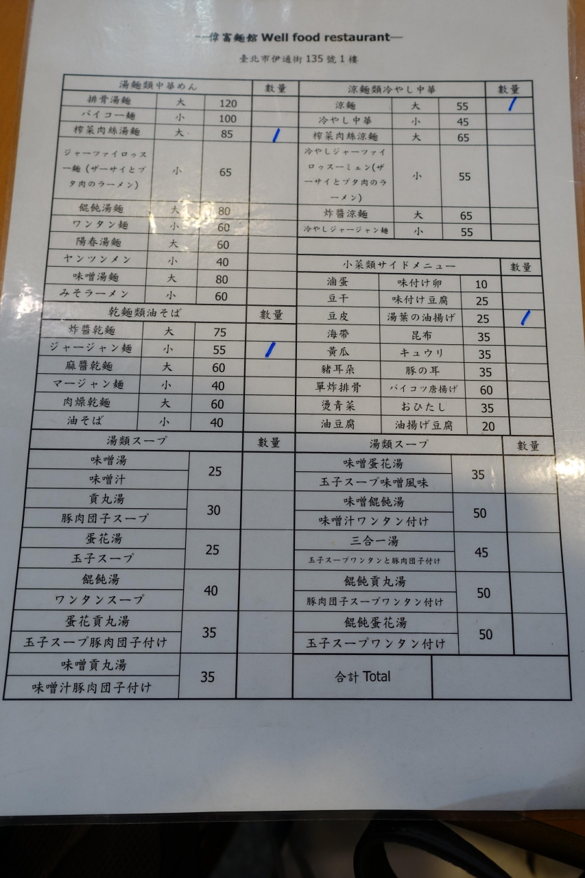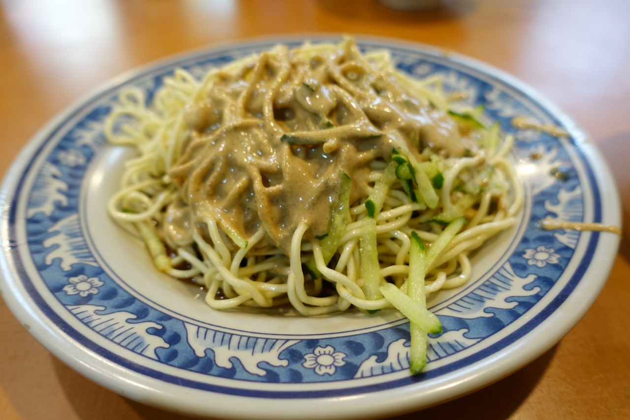 台北二日目の朝食で行きました。以前から台湾の涼麺は大好きで小腹が空いたときによく食べていました。朝早くから開いていて地元の方が殆どのお店ですが、台北の店の中では比較的清潔です。テーブル席以外にお一人様用の壁に面したカウンター席もあり気兼ねせずに食べられます。ここでは涼麺(大)とスープを注文しましたが、注文したら1分くらいで出てきました。日本語はまったく通じませんがメニューは日本語版がありますので全く問題ありませんでした。にんにくはさほど多くなく適度な量が添えられていました。胡瓜の千切りがトッピングされゴマダレがたっぷりかかっていました。きわめてシンプルな食べ物ですが、なぜこれ日本で売らないんだろう?と思うほど好きな味です。