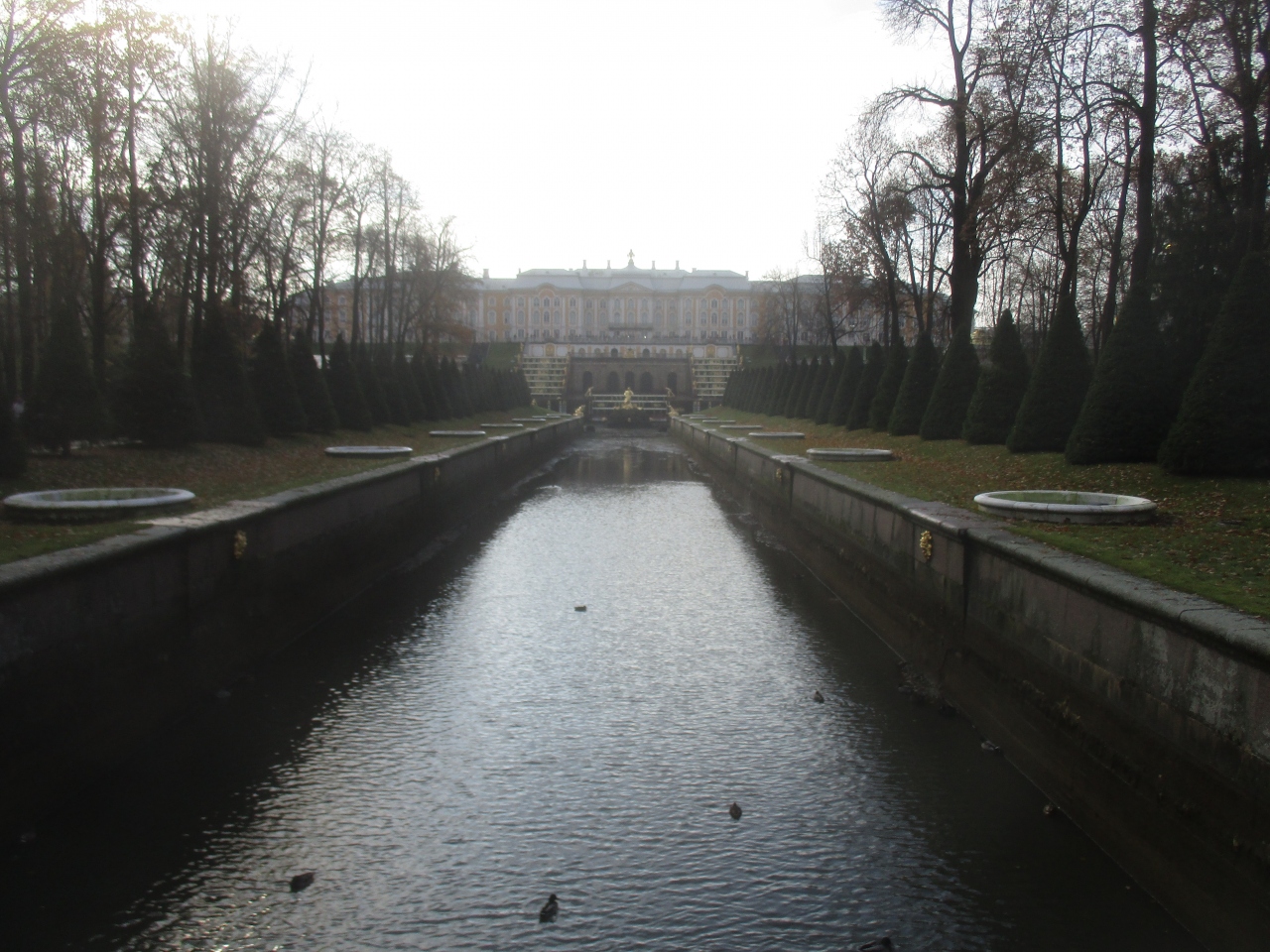 宮殿内を奥に進むとテラスがあり噴水のある池の前に来ました。宮殿側から見下ろすところにあるのが下の公園です。ここには150の噴水と4つの滝があり約20kmも離れた丘から水を引き電気を一切使わず、今現在も当時のまま水力工学による仕組みで動いていました。