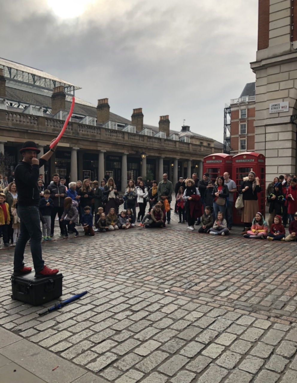 地下鉄コヴェントガーデン駅からすぐ。賑やかなところに向かって行けばすぐ分かります。いろんな不思議なパフォーマンスをやっていて、観光客でワイワイしています。そのパフォーマンスも審査があって、だれでも勝手にやれる訳ではないそうです。