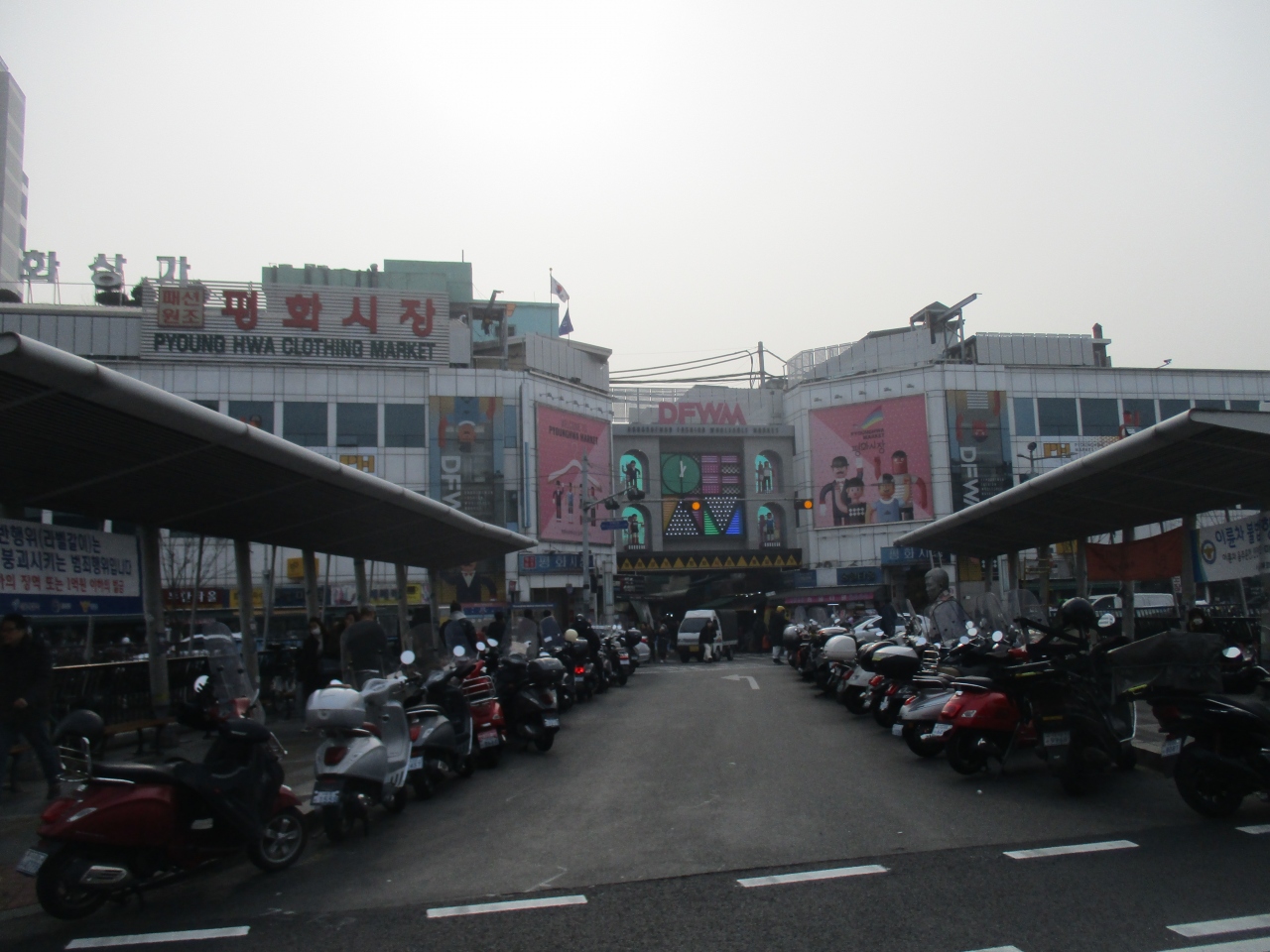 東大門エリアを流れる清渓川沿いに約600mほどお店が並んでいました。韓国最初の総合衣類市場でかなりの店舗が入店していました。もともとは朝鮮戦争時に朝鮮半島北部から非難してきた人々が衣類を売る市場だったそうなので、カジュアルな衣服だけでなくビジネス用スーツや反物を扱っていました。