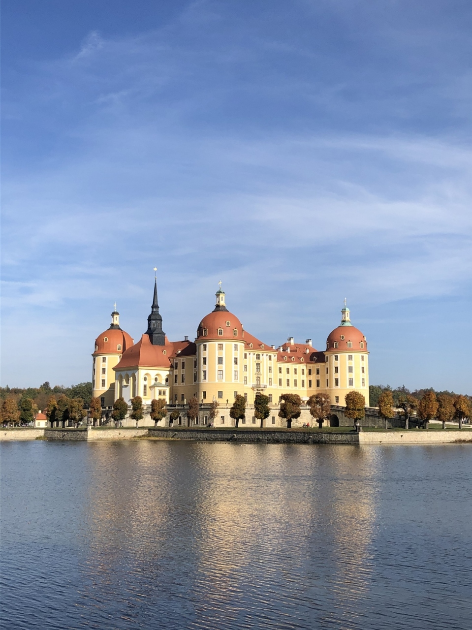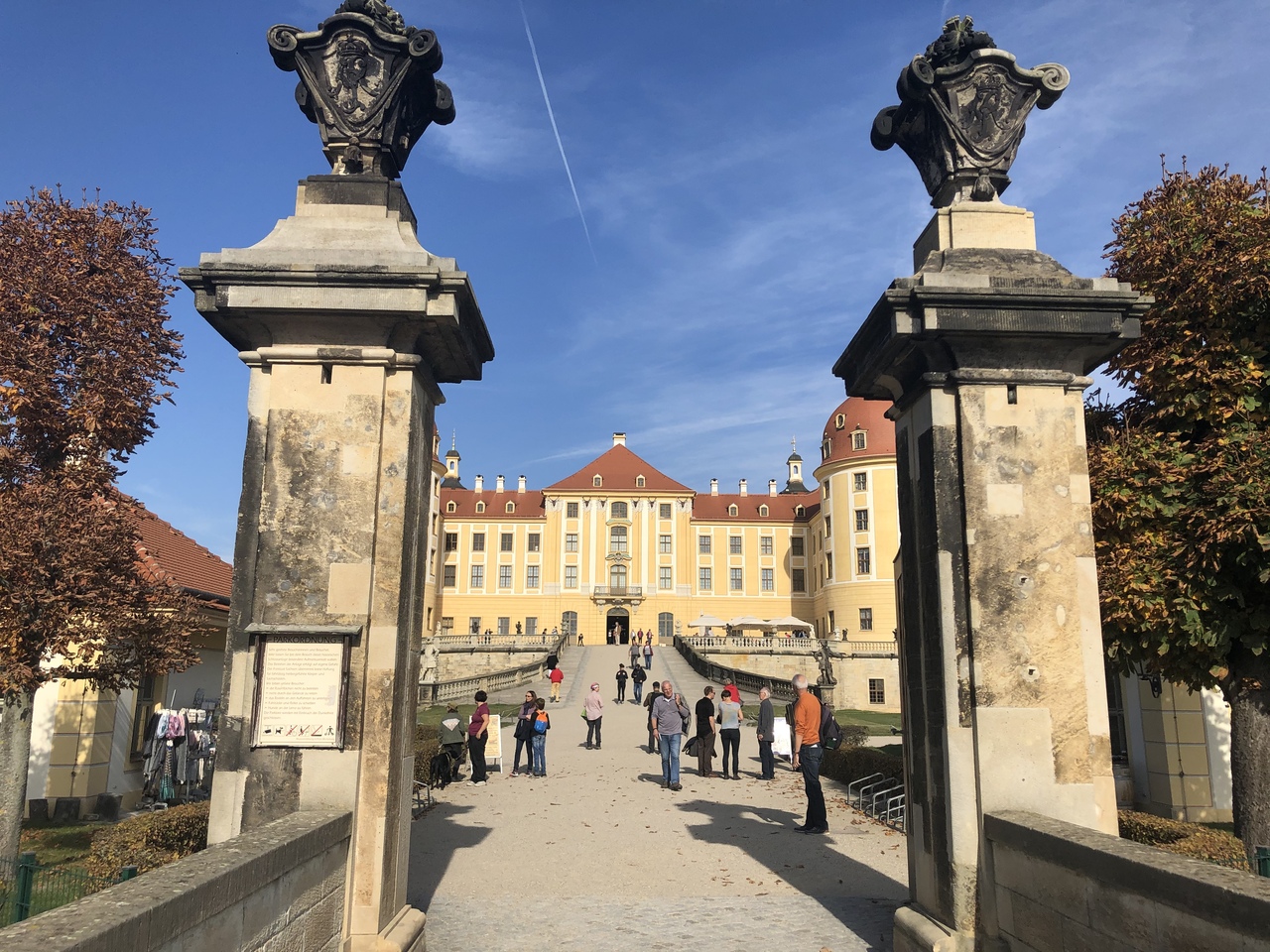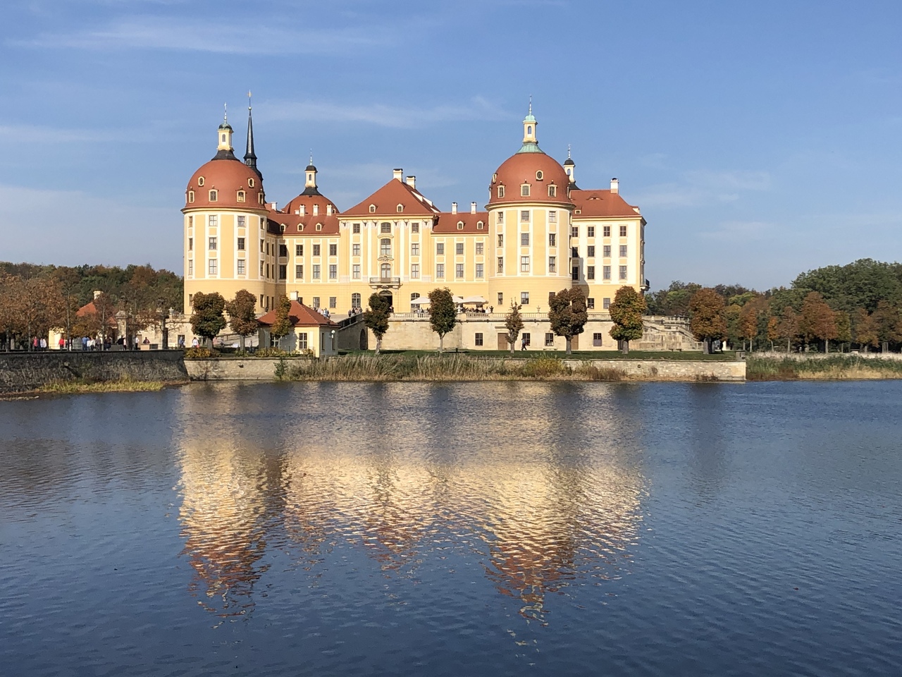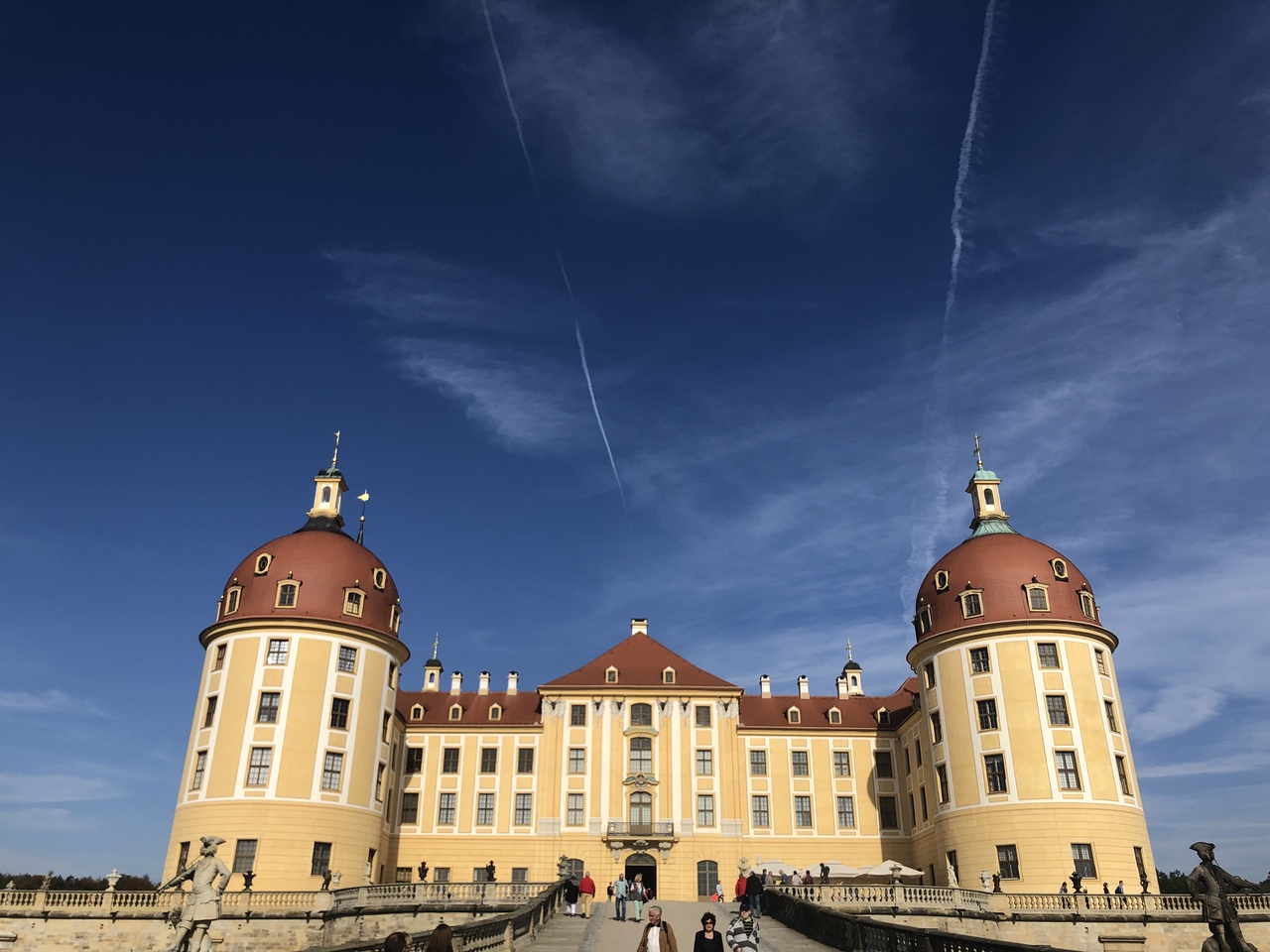 私達のルートは、プラハからDresden 中央駅までRegio Jetで2時間、その後Dresden Neustadt駅へ移動し、駅前のバス停から477番バスで約30 分、Moritzburg Schlossで下車すると、お城が正面に見えます。