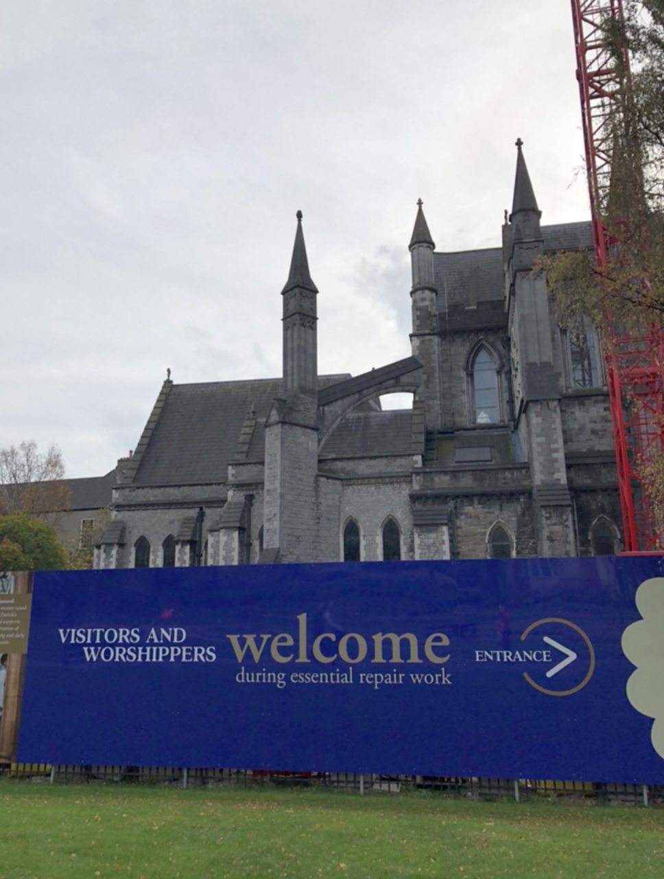 クライストチャーチ大聖堂から徒歩7分で行きました。まずその手前の公園に入ります。広い公園から大きい大聖堂を綺麗に写真を撮れますが、工事中で半分は覆われています。入り口に回して入ろうとしたが、入場料8ユーロ!