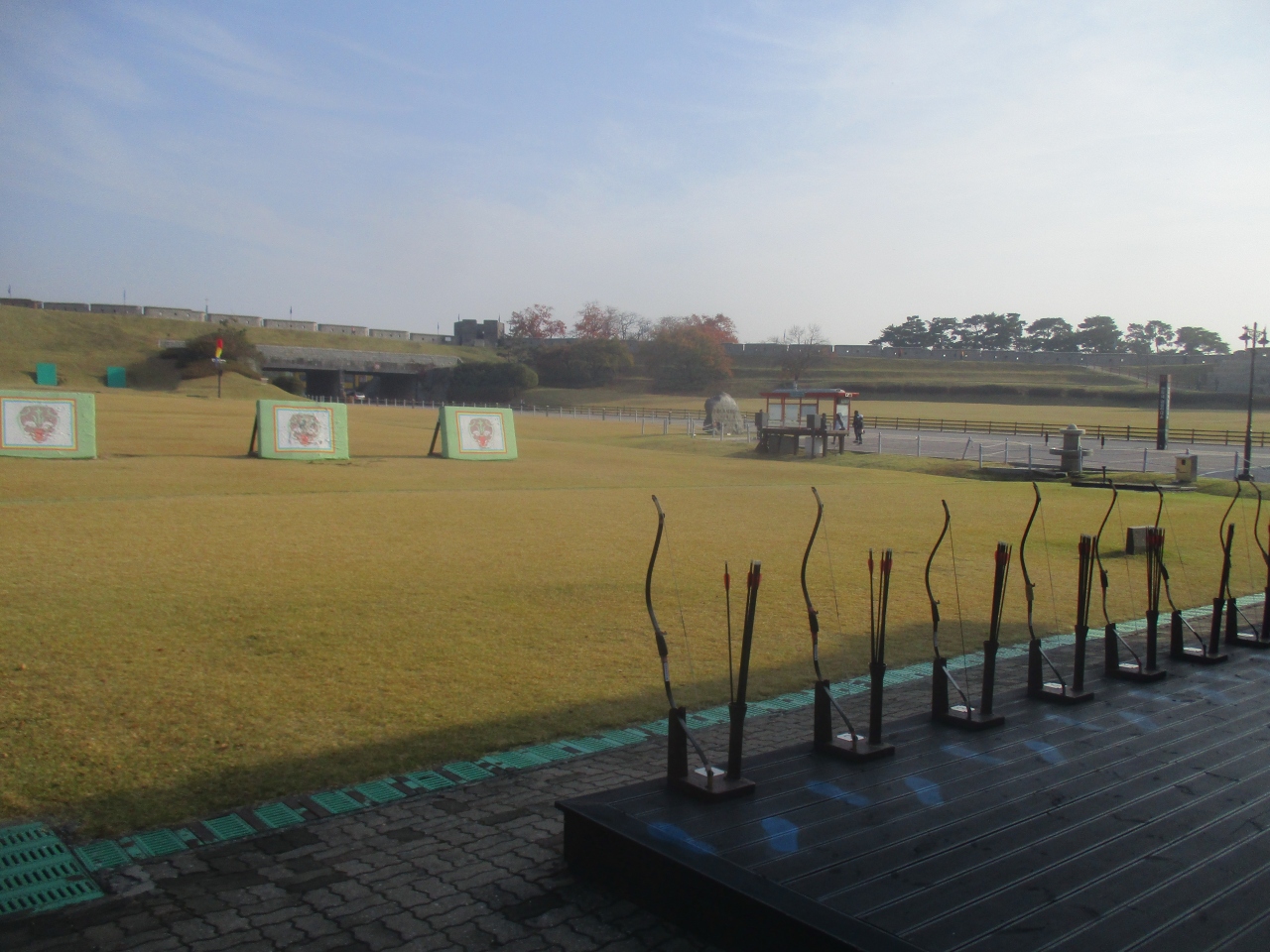 水原華城の入口付近に弓道広場がありました。城壁や歴史的な建築物よりも野外にあるこの広い弓場が目に入ります。日本の弓道は遠くない的へまっすぐにねらいをつけて射るのに対し、ここの弓は的がかなり遠くにあるように感じました。また、常設の体験施設のようでした。