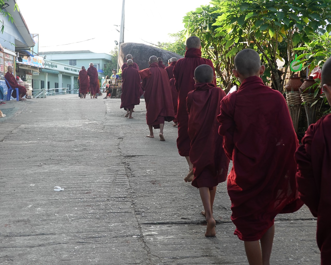 ホテルが山腹のケーブルカー駅近くだったので、夕方と早朝の2度観ることができました。特に良かったのが日の出ごろ。朝日に煌めくゴールデンロックは、日中に観たものよりも神々しさが増していました。また、6時ごろから7時ごろの時間帯は、山頂近くの僧院で修行されている僧侶の托鉢を見ることができます。1,000チャットでご飯が11個に小分けされた袋を買って、お布施として渡す体験もできます。ピックアップトラックで体験するジェットコースターのようなスリリングさも、思い出深いものになりました。もう1度訪ねる機会があれば、山頂のホテルに泊まり、夕暮れのサンセットやライトアップの様子をぜひ見てみたい!