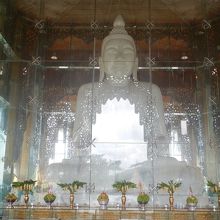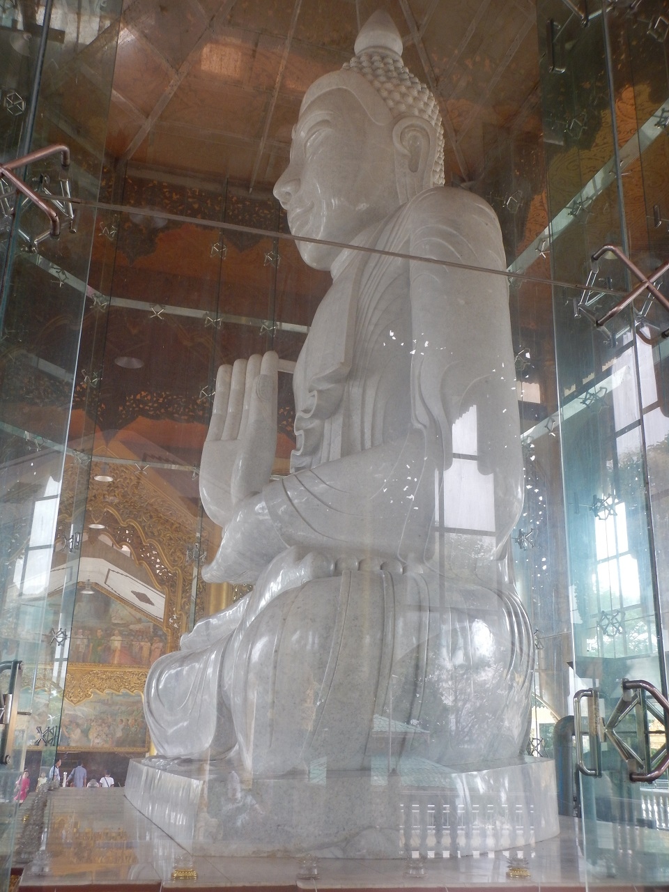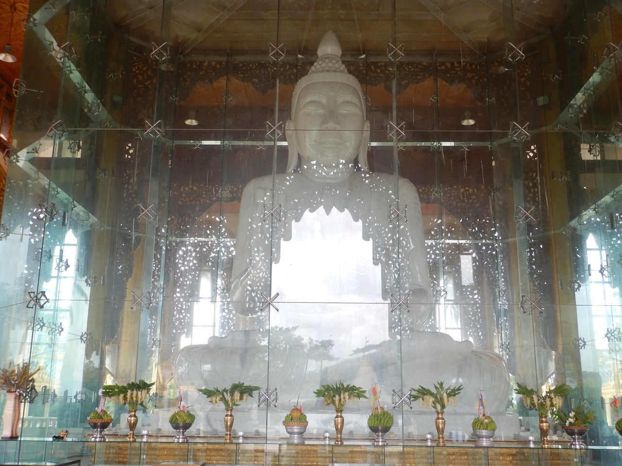 ヤンゴン国際空港に近いパゴダに鎮座する白い大仏。マンダレーに近いザガインヒルで発掘され、ヤンゴンへ移設されました。高さ11.3m、幅7.3mの大理石で作られた仏像で、重量は2600トンだとか。ガラスで覆われているため、光の状態によりお腹が空洞に見える写真が撮れるのが面白いです。