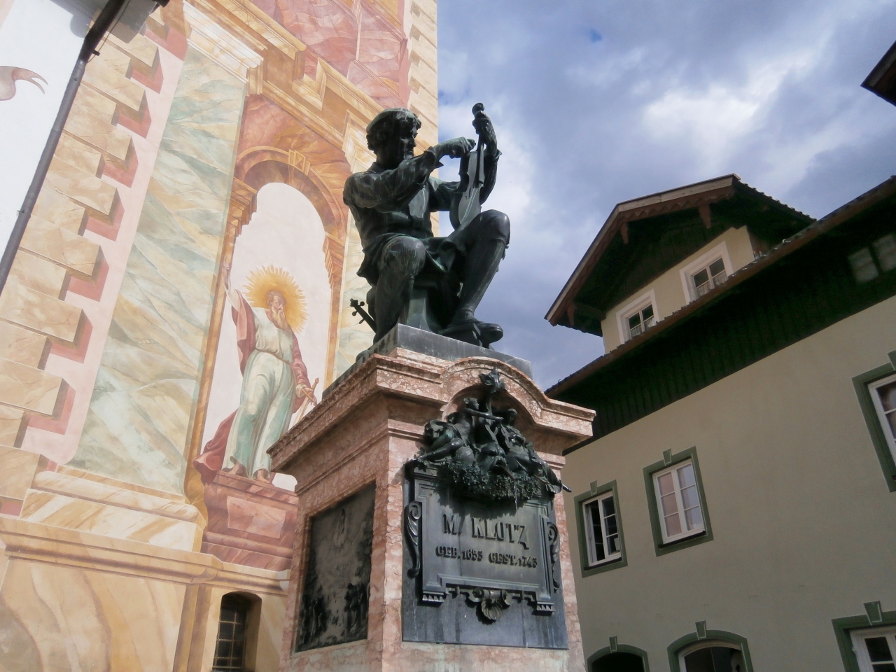 教会の前には、ミッテンヴァルトにバイオリン作りの技術をもたらしたマティアス・クロツの像が立っています。