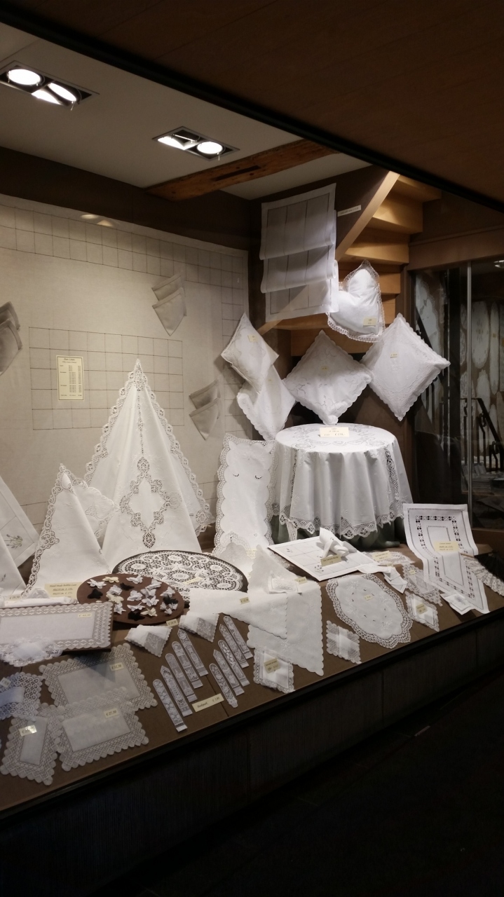 テーブルクロスやティッシュカバー等、様々なレース用品があり、また可愛らしい柄のゴブラン織りのクッション等があります。