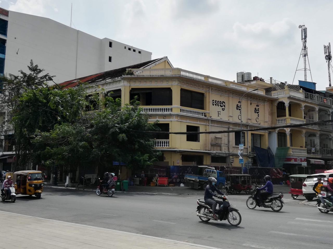 ポルポト政権時代に国際ジャーナリストが報道を続けたFCC Phnom Penh。ぜひ訪れたくて行ってみましたが、2019年11月現在で工事中。FCCプノンペンCollectionとして生まれ変わるようですが、いつオープンするのかはわかりませんでした。「FCC」の文字が大きく書かれたビルの外観だけは、工事中の今でも見ることができます。