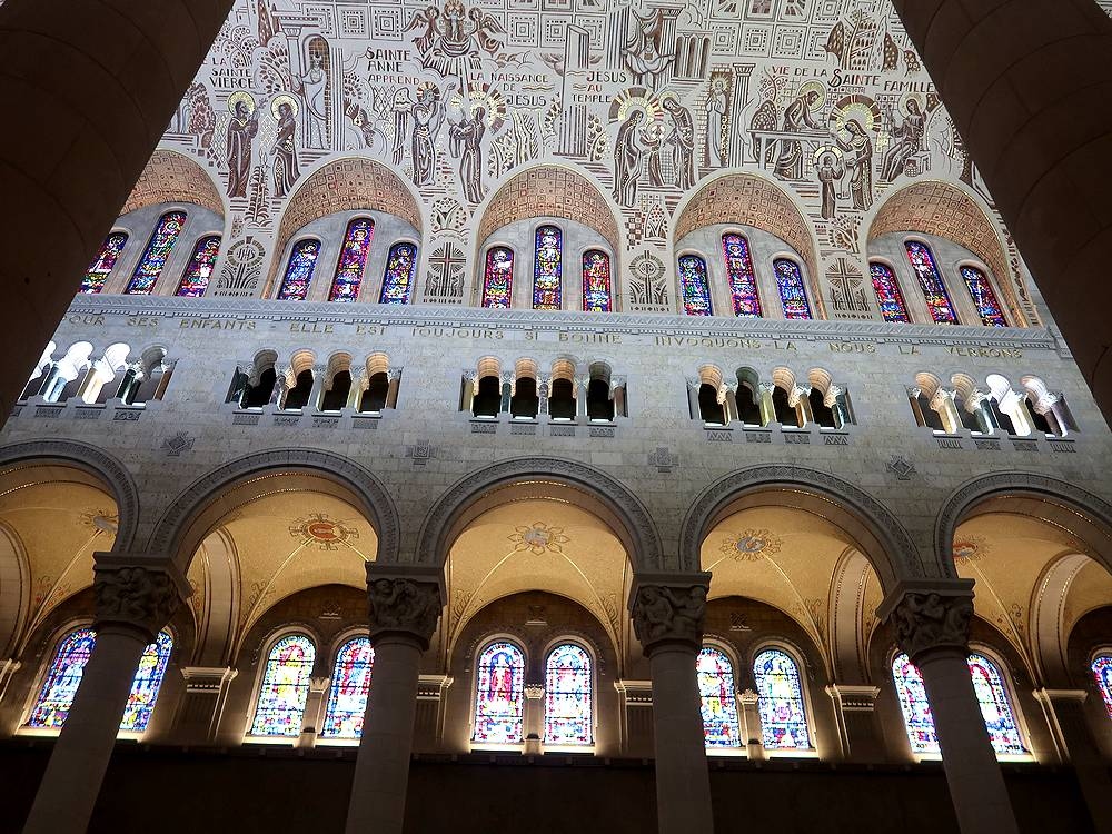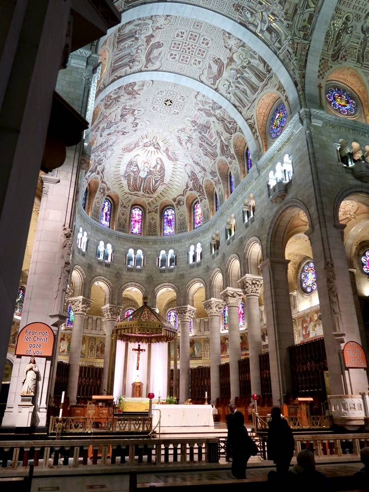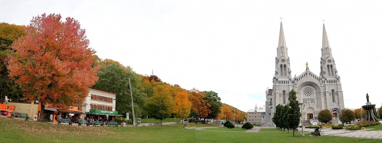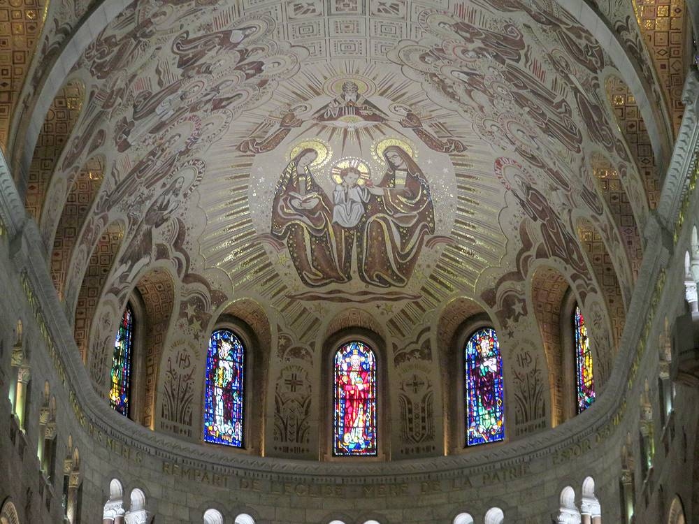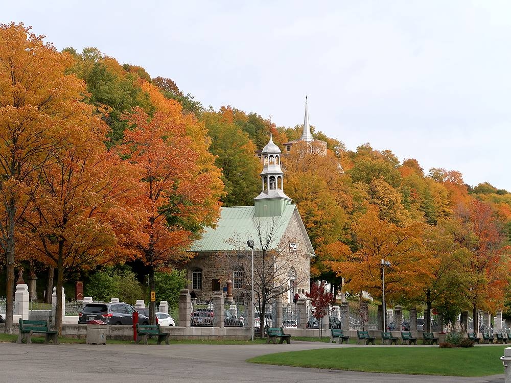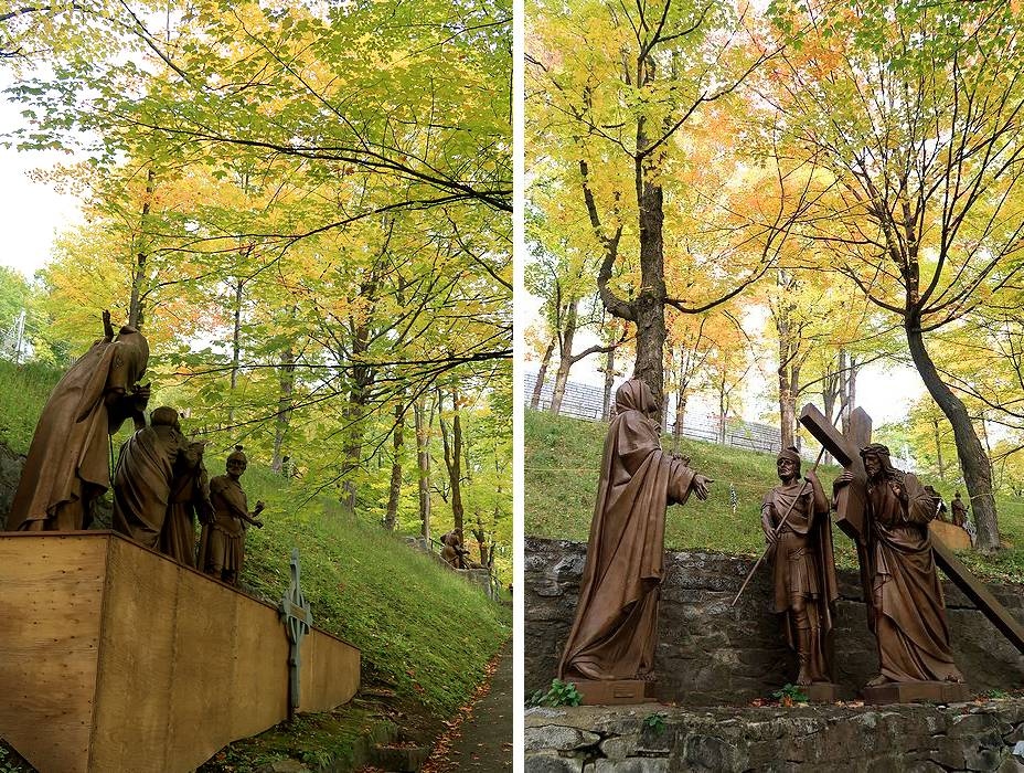 秋の紅葉が美しい時、シャルルボアに行く途中で訪れました。この大聖堂の存在はホテルを探しているときに偶然知りました。この大聖堂はケベックから138号線を20キロ位走ると、サンタンヌ・ド・ボープレ(Sainte-Anne-de-Beaupre)という小さな町にあります。実際行ってみると、周囲の紅葉が素晴らしく、大聖堂も外観ばかりでなく、内部もうつくしいものでした。ケベック州では2番目に大きい聖堂であり、守護神聖アンネを祀り、キリスト教徒にとっての巡礼地でもあるためか、多くの観光客や信者が訪れているようでした。私達が訪れた時も大型バスで大勢の観光客が訪れていました。内部は無料で入れ、撮影もできました。聖アンネの像の周りにひざまづいて、祈りをささげている人達もみられました。大聖堂は起源が1658年、フランス植民地ニューフランス時代の初期に建てられました。その後何度も建て替えられて、今の建物は1946年に完成したもので、比較的新しい建物です。内部は、床のモザイクや天井画やステンドグラスなどがすばらしく見逃せません。大聖堂横の斜面にはキリストの十字架昇降にまつわる物語の彫像群が展示されています。合わせて見学することをお勧めします。