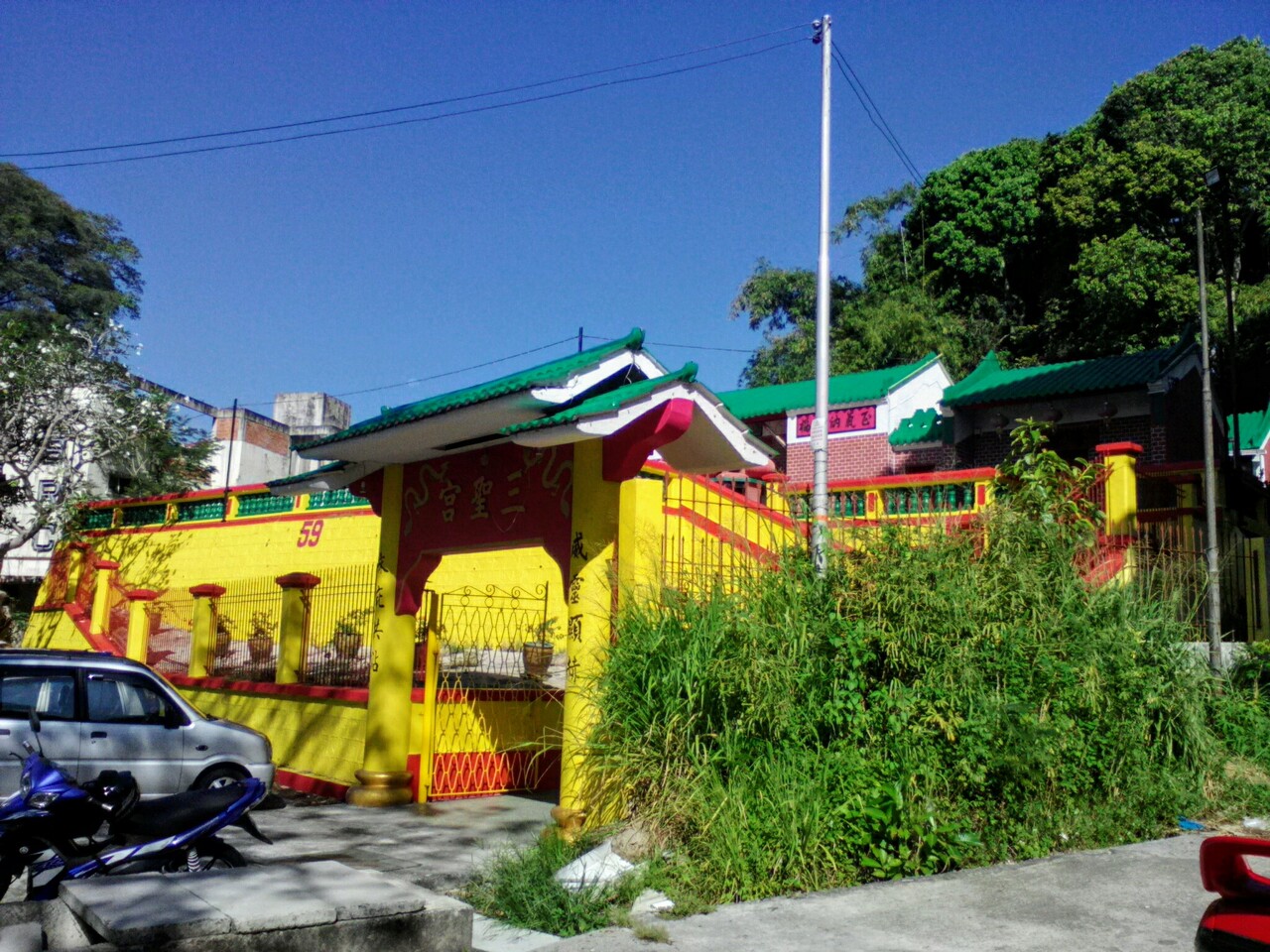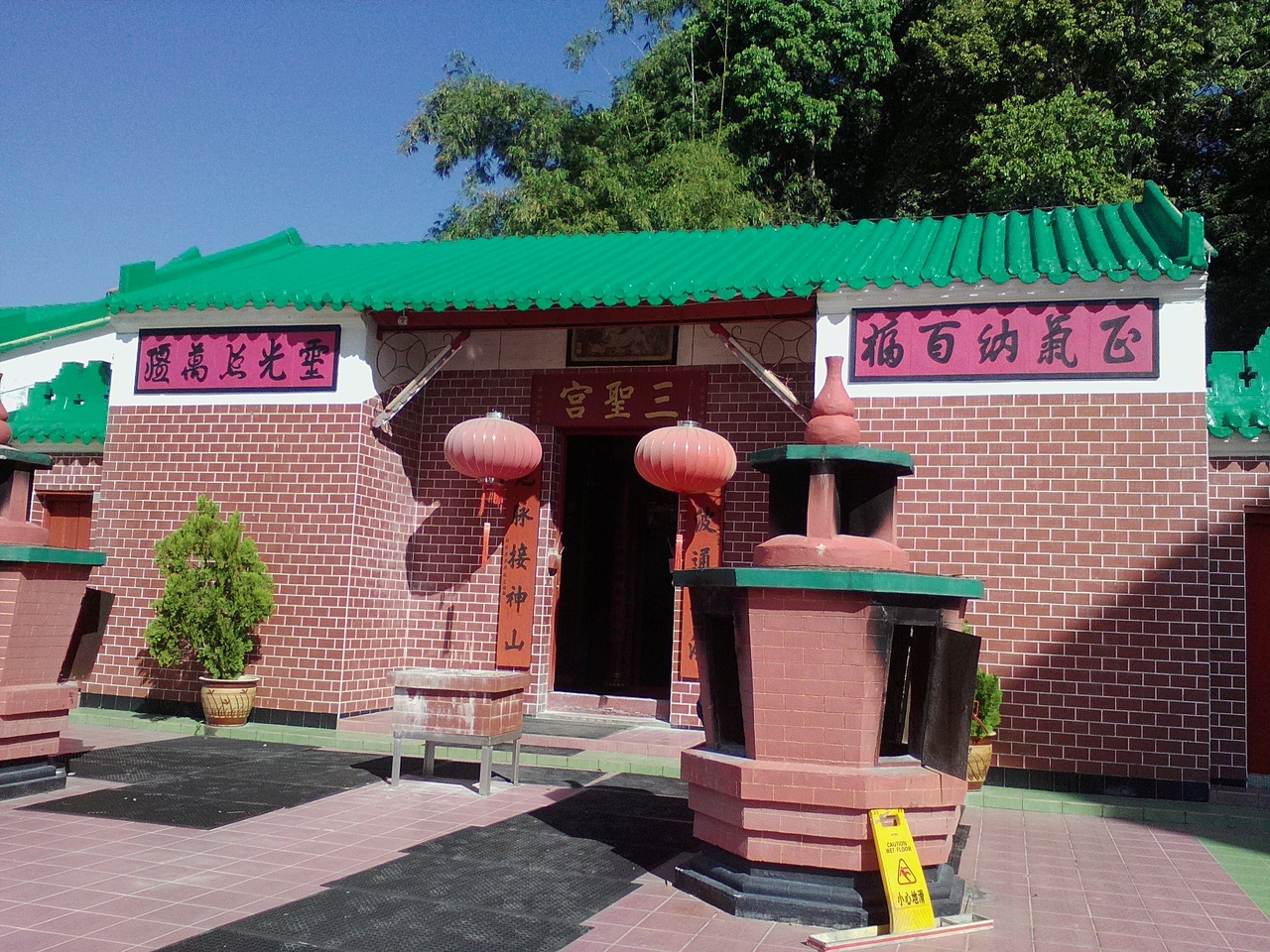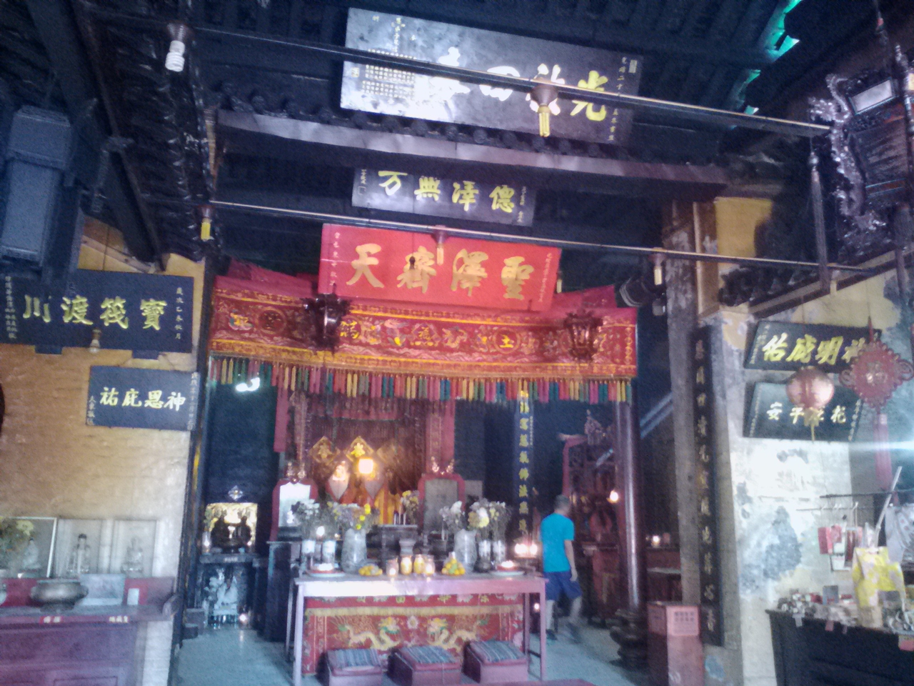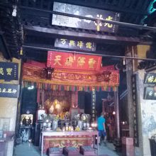 1880年代に建てられたサンダカンで最古の寺のようですが、外観からは絶対に想像できないと思います。なぜなら外壁が原色の真っ黄っ黄色で塗られているからです。以前の写真を見ると塗装なしのいい感じ。誰だ、こんな色に塗ったのは。責任者出てこい。と言いたくなりますがこれが派手派手好きの中国寺院の色彩感覚なのでしょうか。それに比べ、お堂の中は一変。趣きのある古い造り、最古なのが納得できます。寺の名前のとおり3体の神様が祀られています。