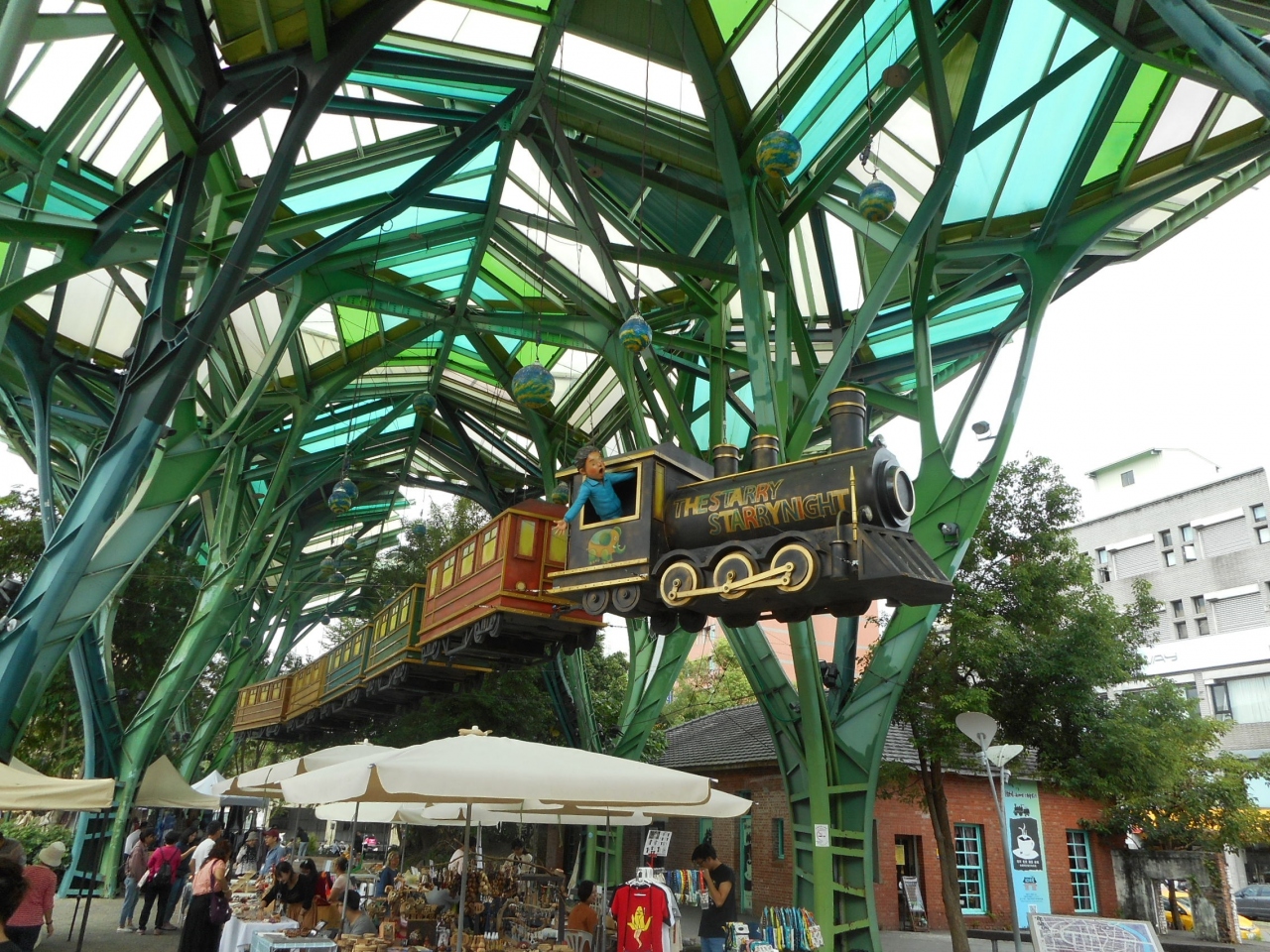 正面の横断歩道をわったった公園には、天井から汽車が吊られたオブジェがあります。