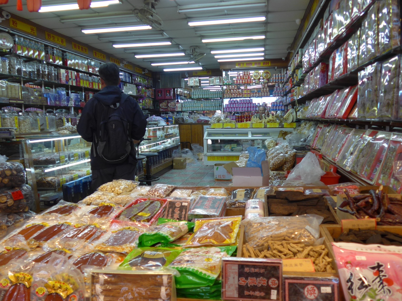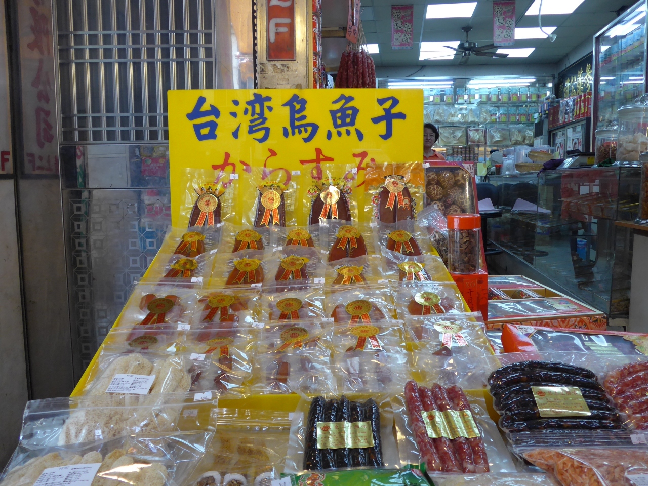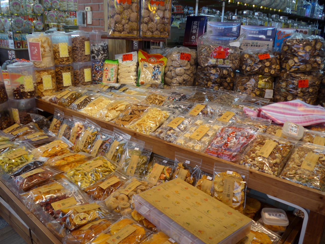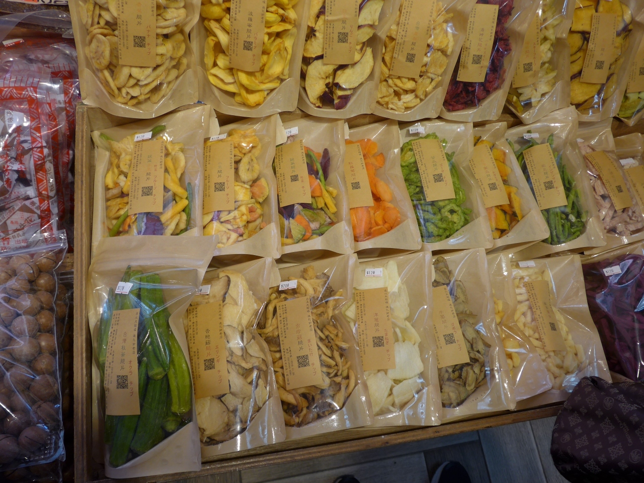 特に目についたのがからすみ、干し貝柱、きくらげやシイタケの乾したもの中には色んな野菜をそのまま乾燥した小袋を販売している物もありました。