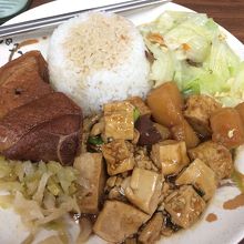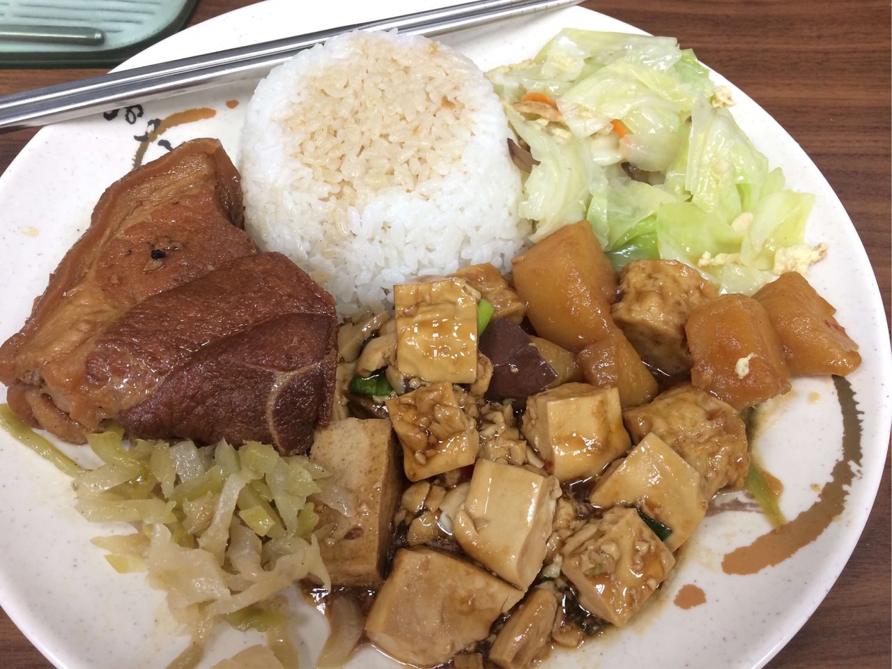 台北市では、このお値段でこんあにボリュームよく食べれる場所は少ないと思いました。新北市は、やはり少し台北よりも安いです。ただし、豆腐のおかずにカモの血の塊が入っていたので、そのおかずはやめた方がいいです。